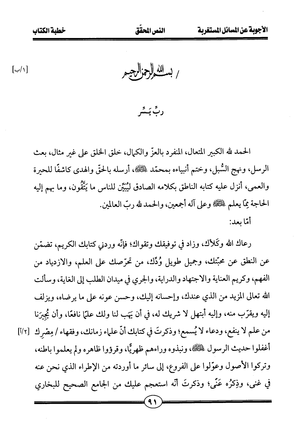 رعاك الله وكَلأك، وزاد في توفيقك وتقواك؛ فإنّه وردني كتابك الكريم، تضمّن عن النطق عن محبّتك، وجميل طويل وُدِّك، من تحرّصك على العلم، والازدياد من الفهم، وكريم العناية والاجتهاد والدراية، والجري في ميدان الطلب إلى الغاية، وسألت الله تعالى المزيد من الذي عندك، وإحسانه إليك، وحسن عونه على ما يرضاه، ويزلف إليه ويقرّب منه، وإليه أبتهل لا شريك له، في أن يَهَب لنا ولك علمًا نافعًا، وأن يُجِيرَنا من علم لا ينفع، ودعاء لا يُسمع؛ وذكرتَ في كتابك أنّ علماء زمانك، وفقهاء مِصْرِك أغفلوا حديث الرسول - صلى الله عليه وسلم -، ونبذوه وراءهم ظهريًّا، وقرؤوا ظاهره ولم يعلموا باطنه، وتركوا الأصول وعوّلوا على الفروع، إلى سائر ما أوردته من الإطراء الذي نحن عنه في غنى، وذِكرُه عَنًى؛ وذكرتَ أنَّه استعجم عليك من الجامع الصحيح للبخاري