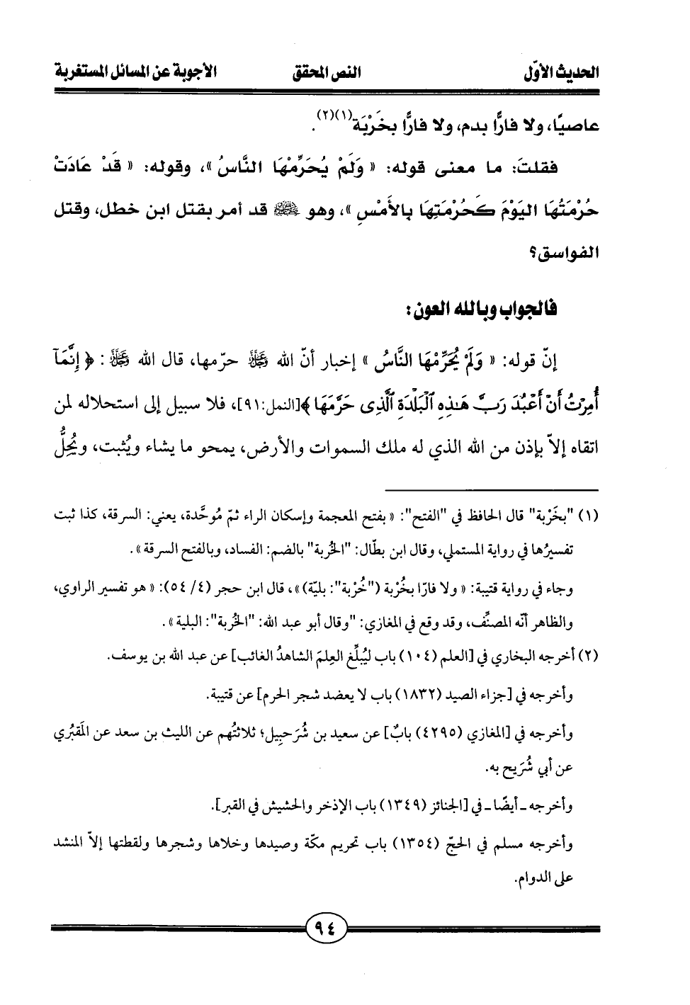 فقلتَ: ما معنى قوله: "وَلَمْ يُحَرِّمْهَا النَّاسُ"، وقوله: "قَدْ عَادَتْ حُرْمَتُهَا اليَوْمَ كَحُرْمَتِهَا بالأَمْسِ"، وهو - صلى الله عليه وسلم - قد أمر بقتل ابن خطل، وقتل الفواسق؟