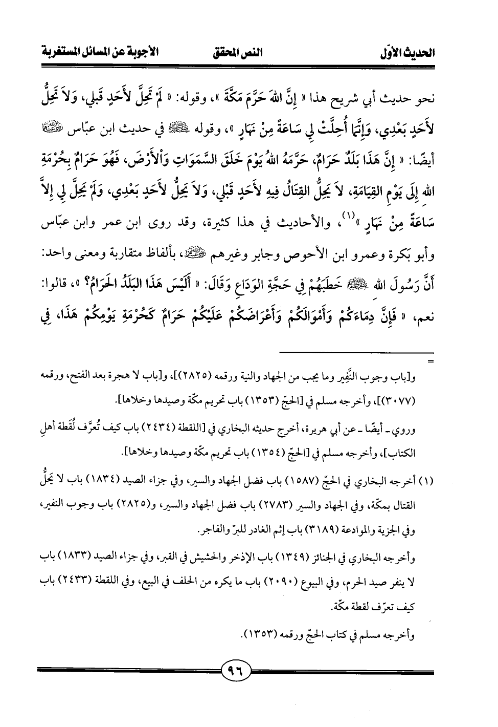 نحو حديث أبي شريح هذا "إِنَّ اللهَ حَرَّمَ مَكَّةَ"، وقوله: "لَمْ تَحِلَّ لأَحَدٍ قَبلي، وَلاَ تَحِلُّ لأَحَدٍ بَعْدِي، وَإِنَّمَا أُحِلَّتْ لِي سَاعَةً مِنْ نَهَارٍ"، وقوله - صلى الله عليه وسلم - حديث ابن عبّاس - رضي الله عنهما - أيضًا: "إِنَّ هَذَا بَلَدٌ حَرَامٌ، حَرَّمَهُ اللهُ يَوْمَ خَلَقَ السَّمَوَاتِ وَاْلأَرْضَ، فَهُوَ حَرَامٌ بِحُرْمَةِ اللهِ إِلَى يَوْمِ القِيَامَةِ، لاَ يَحِلُّ القِتَالُ فِيهِ لأَحَدٍ قَبْلي، وَلاَ يَحِلُّ لأَحَدٍ بَعْدِي، وَلَمْ يَحِلَّ لِي إِلَّا سَاعَةً مِنْ نَهَارٍ" (¬1)، والأحاديث في هذا كثيرة، وقد روى ابن عمر وابن عبّاس وأبو بَكرة وعمرو ابن الأحوص وجابر وغيرهم - رضي الله عنهم -، بألفاظ متقاربة ومعني واحد: أَنَّ رَسُولَ اللهِ - صلى الله عليه وسلم - خَطَبَهُمْ فِي حَجَّةِ الوَدَاعِ وَقَالَ: "أَليْسَ هَذَا البَلَدُ الحَرَامُ؟ "، قالوا: نعم، "فَإِنَّ دِمَاءَكُمْ وَأَمْوَالَكُمْ وَأَعْرَاضَكُمْ عَلَيْكُمْ حَرَامٌ كَحُرْمَةِ يَوْمِكُمْ هَذَا، فِي