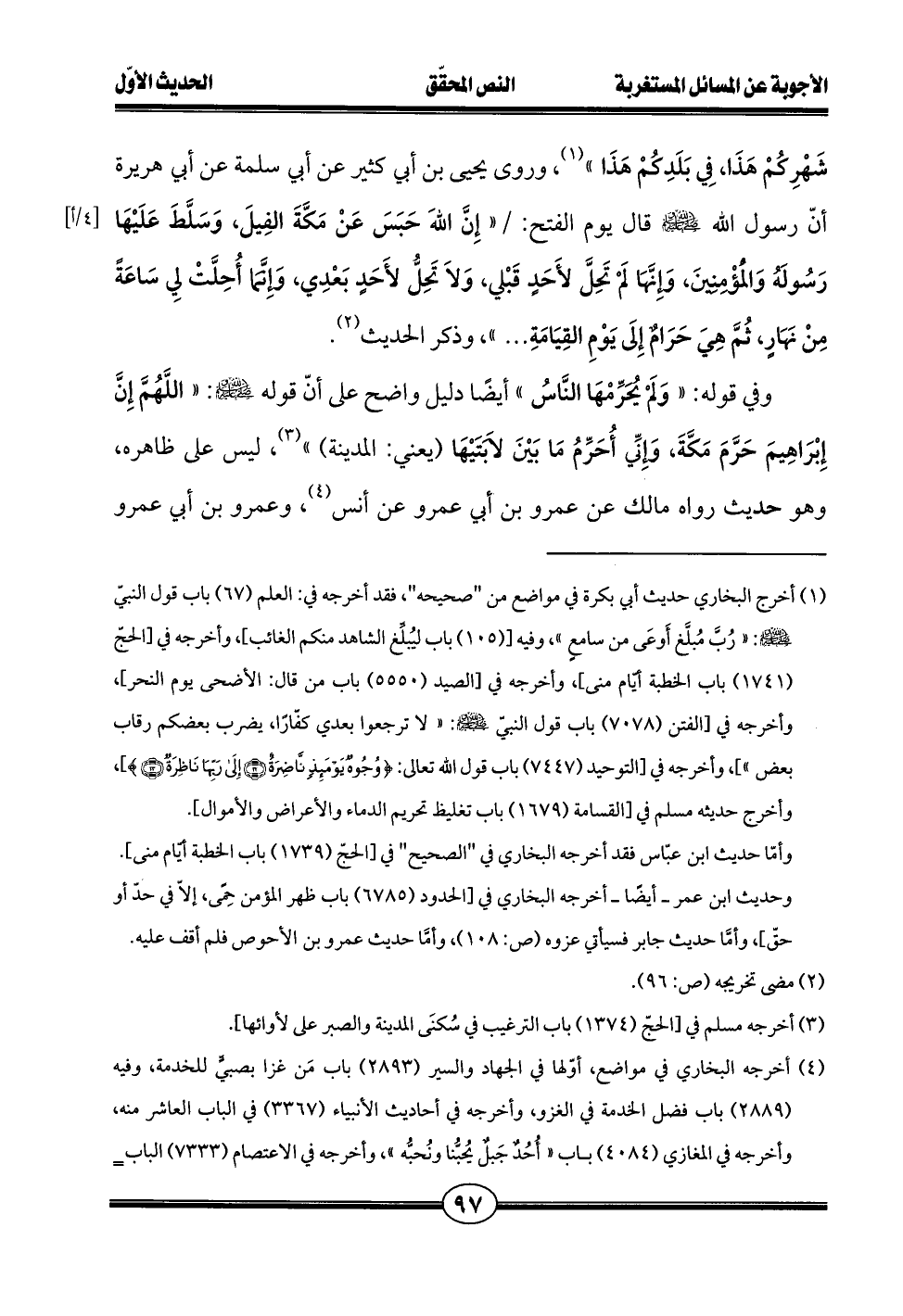 شَهْرِكُمْ هَذَا، فِي بَلَدِكُمْ هَذَا" (¬1)، وروى يحيى بن أبي كثير عن أبي سلمة عن أبي هريرة أنّ رسول الله - صلى الله عليه وسلم - قال يوم الفتح: "إِنَّ اللهَ حَبَسَ عَنْ مَكَّةَ الفِيلَ، وَسَلَّطَ عَلَيْهَا رَسُولَهُ وَالْمؤْمِنِينَ، وَإِنَّهَا لَمْ تَحِلَّ لأَحَدٍ قَبْلي، وَلاَ تَحِلُّ لأَحَدٍ بَعْدِي، وَإِنَّمَا أُحِلَّتْ لِي سَاعَةً مِنْ نَهَارٍ، ثُمَّ هِيَ حَرَامٌ إِلَى يَوْمِ القِيَامَةِ ... "، وذكر الحديث (¬2).