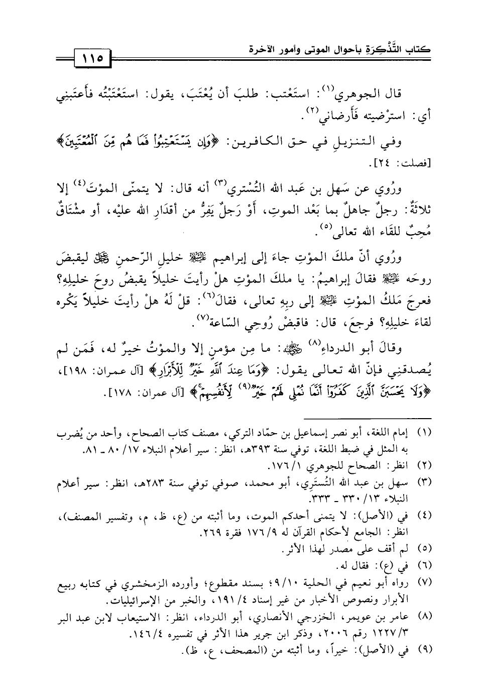 وقال أبو الدرداء رضي الله عنه: ما من مؤمن إلا والموت خير له فمن لم يصدقني فأن الله تعالى يقول: {وما عند الله خير للأبرار} وقال تعالى {ولا يحسبن الذين كفروا أنما نملي لهم خير لأنفسهم}