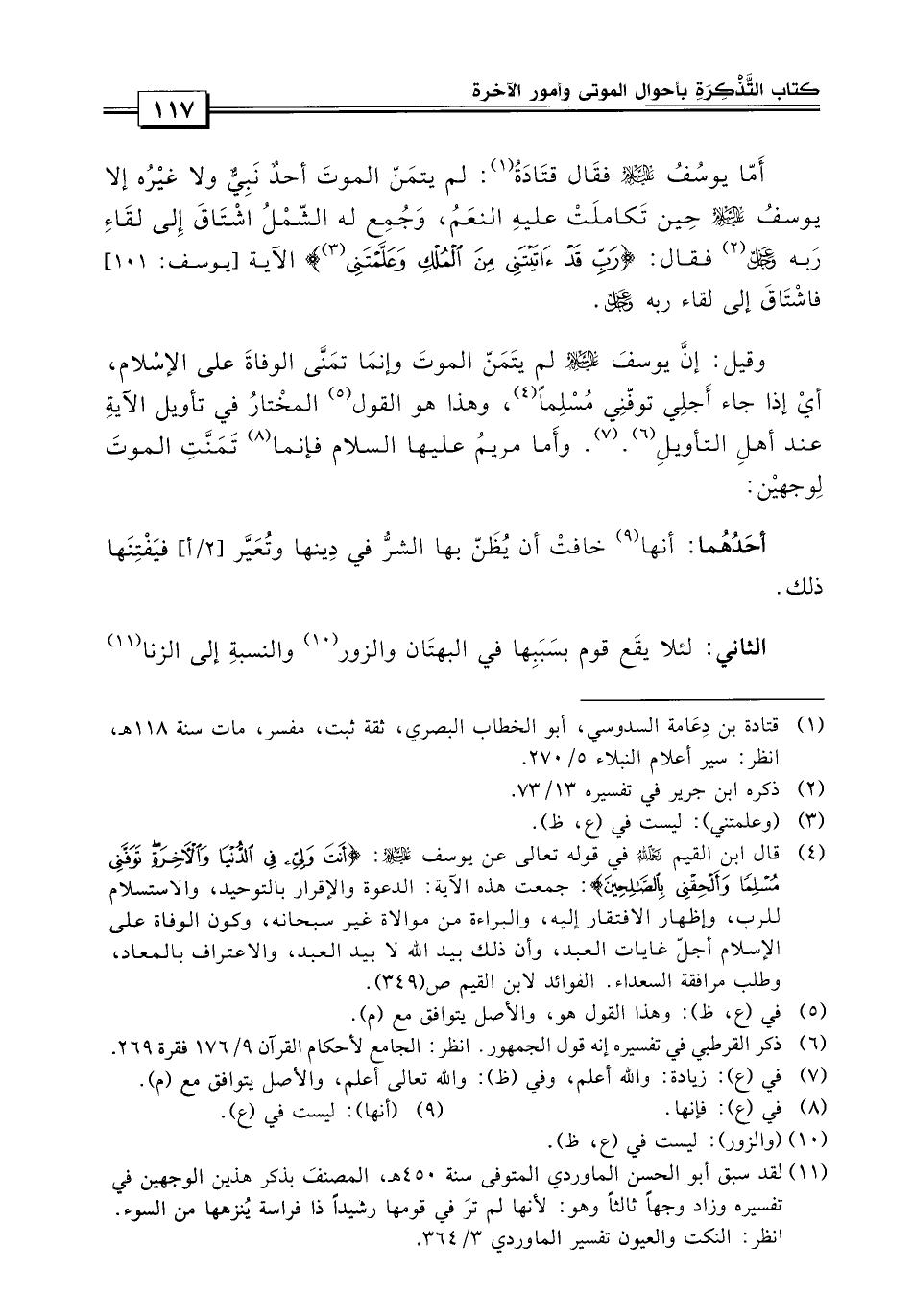وأما مريم عليها السلام فإنما تمنت الموت لوجهين: