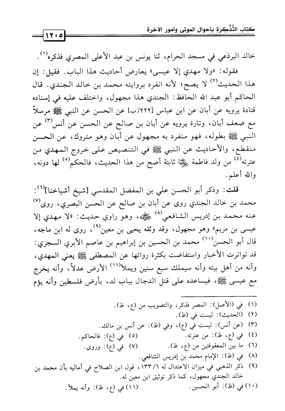 فقيل إن هذا الحافظ: الجندي هذا مجهول واختلف عليه في إسناده قتادة يرويه عن أبان بن صالح، عن الحسن، عن النبي صلى الله عليه وسلم مرسلاً مع ضعف أبان، وتارة يرويه عن أبان ابن صالح عن الحسن عن أنس بن مالك عن النبي صلى الله عليه وسلم بطوله، فهو منفرد به مجهول عن أبان وهو متروك عن الحسن منقطع والأحاديث عن النبي صلى الله عليه وسلم في التنصيص على خروج المهدي من عترته من ولد فاطمة ثابتة أصح من هذا الحديث فالحكم لها دونه.