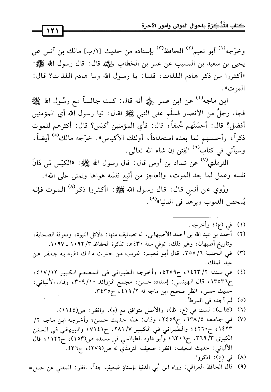وخرجه أبو نعيم الحافظ بإسناده من حديث مالك بن أنس «عن يحيى بن سعيد بن المسيب عن عمر بن الخطاب قال: قال رسول الله صلى الله عليه وسلم: أكثروا من ذكر هادم اللذات قلنا يا رسول الله: وما هادم اللذات؟ قال: الموت» .