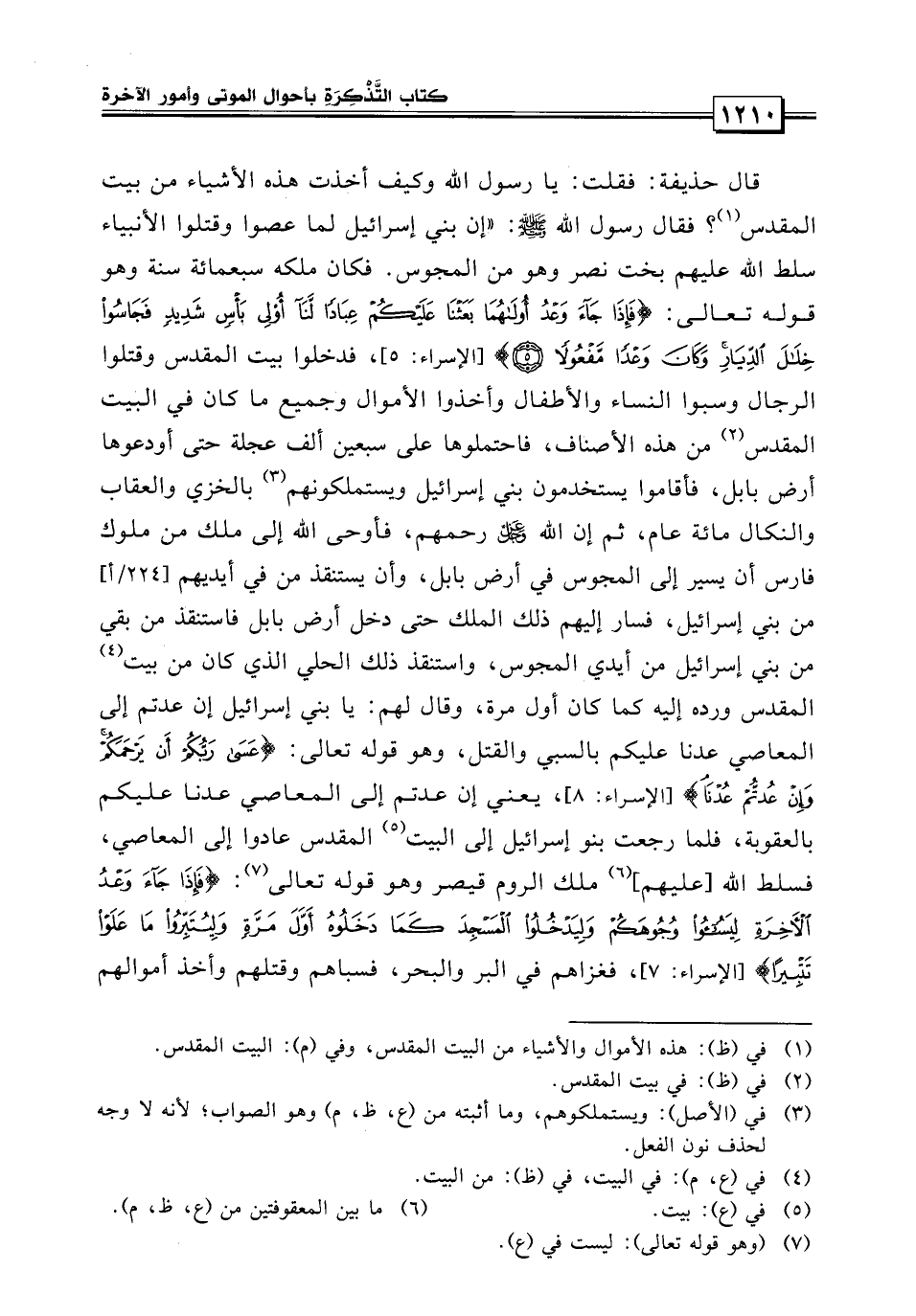 قال حذيفة: فقلت يا رسول الله وكيف أخذت هذه الأشياء من بيت المقدس؟ فقال رسول الله صلى الله عليه وسلم: إن بني إسرائيل لما عصوا وقتلوا الأنبياء سلط الله عليهم بخت نصر وهو من المجوس فكان ملكه سبعمائة سنة وهو قوله تعالى {فإذا جاء وعد أولاهما بعثنا عليكم عباداً لنا أولي بأس شديد فجاسوا خلال الديار وكان وعداً مفعولاً} فدخلوا بيت المقدس وقتلوا الرجال وسبوا النساء والأطفال وأخذوا الأموال وجميع ما كان في بيت المقدس من هذه الأصناف، واحتملوها على سبعين ألف عجلة حتى أودعوها