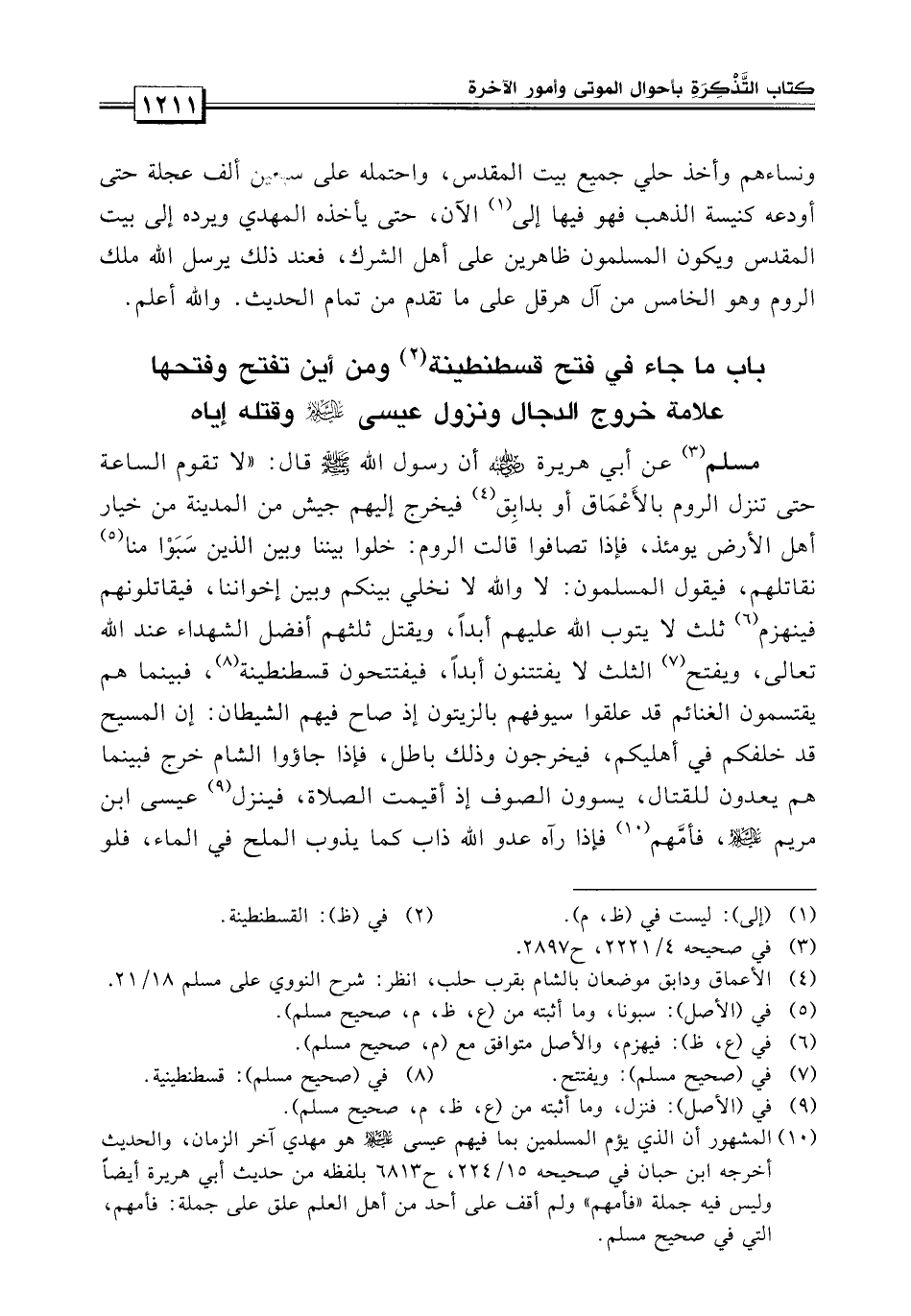 مسلم «عن أبي هريرة أن رسول الله صلى الله عليه وسلم قال: لا تقوم الساعة حتى ينزل الروم بالأعماق أو بدابق فيخرج إليهم جيش من المدينة من خيار أهل الأرض يومئذ، فإذا تصافوا قالت الروم خلوا بيننا وبين الذين سبوا منا نقاتلهم، فيقول المسلمون: لا والله لا نخلي بينكم وبين الذين هم إخواننا فيقاتلهم فيهزم الثلث لا يتوب الله عليهم أبداً، ويقتل ثلثهم أفضل الشهداء عند الله، ويفتح الثلث لا يفتتنون أبداً فيفتحون القسطنطينية، فبينما هم يقتسمون الغنائم وقد علقوا سيوفهم بالزيتون إذ صاح فيهم الشيطان: إن المسيح قد خلفكم في أهلكم فيخرجون وذلك باطل، فإذا جاءوا الشام خرج فبينما هم يعدون للقتال ويسوون الصفوف إذ أقيمت الصلاة، فينزل عيسى بن مريم فأمهم فإذ رآه عدو الله ذاب كما يذوب الملح في الماء فلو