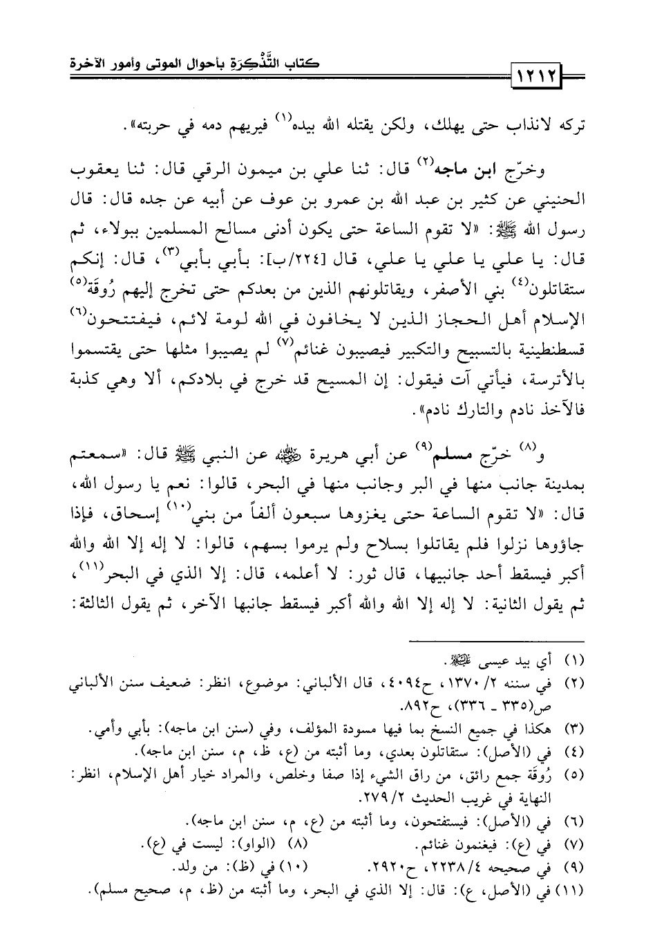 وخرج ابن ماجه قال: «حدثنا علي بن ميمون الرقي قال: حدثنا يعقوب الحنيني عن كثير بن كثير بن عبد الله بن عمرو بن عوف عن أبيه عن جده قال: قال رسول الله صلى الله عليه وسلم لا تقوم الساعة حتى يكون أدنى مسالح المسلمين ببولاء، ثم قال يا علي يا علي يا علي ثم قال يا بني قال: إنكم ستقاتلون بني الأصفر ويقاتلهم الذين من بعدكم حتى يخرج إليهم روقة الإسلام أهل الحجاز الذين لا يخافون في الله لومة لائم ثم فيفتحون قسطنطينية بالتسبيح والتكبير فيصيبون غنائم لم يصيبوا مثلها حتى يقتسموا بالأترسة، فيأتي آت فيقول إن المسيح قد خرج إلى بلادكم ألا وهي كذبة فالآخذ نادم والتارك نادم» .