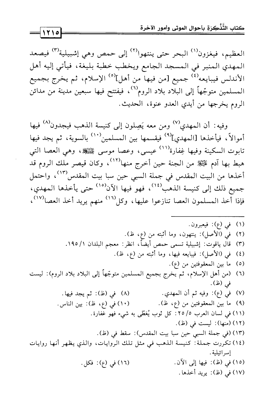 العظيم، فيعبرون البحر حتى ينتهوا إلى حمص وهي إشبيلية، فيصعد المهدي المنبر في المسجد الجامع ويخطب خطبة بليغة، فيأتي إليه أهل الأندلس فيبايعه جميع من بها من أهل الإسلام، ثم يخرج بجميع المسلمين متوجهاً على البلاد بلاد الروم، فيفتح فيها سبعين مدينة من مدائن الروم يخرجها من أيدي العدو عنوة.