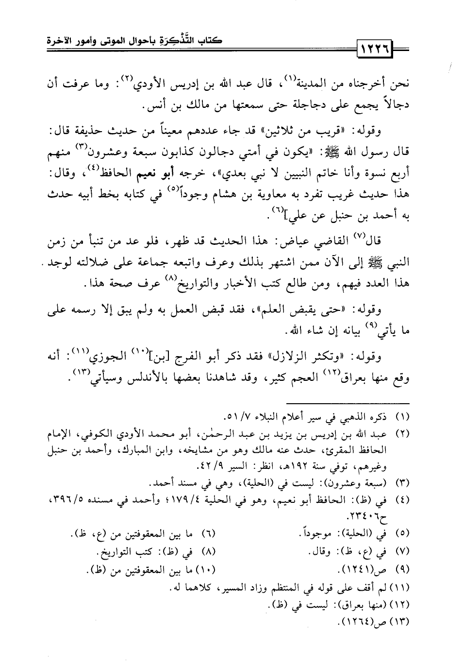 وقوله: وتكثر الزلازل فقد ذكر أبو الفرج بن الجوزي أنه وقع منها بعراق العجم كثير، وقد شاهدنا بعضها بالأندلس وسيأتي