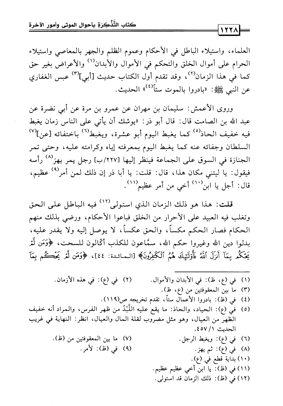 وروى الأعمش سليمان بن مهران، عن عمرو بن مرة، عن أبي نضرة، عن عبد الله بن الصامت قال: قال أبو ذر رضي الله عنه: يوشك أن يأتي على الناس زمان يغبط فيه خفيف الحاذ كما يغبط اليوم أبو عشرة، ويغبط الرجل باختفائه عن السلطان وجفائه عنه كما يغبط اليوم بمعرفته إياه وكرامته عليه، وحتى تمر الجنازة في السوق على الجماعة فينظر إليها الرجل تهتز بهذا رأسه، فيقول يا ليتني مكان هذا.