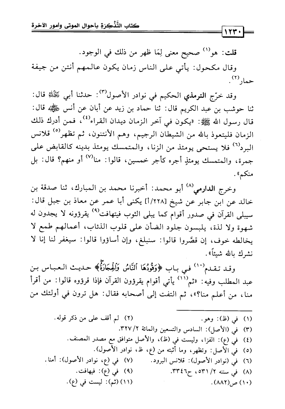 وقد خرج الترمذي الحكيم في نوادر الأصول قال: «حدثنا أبي رحمه الله قال: حدثنا حوشب بن عبد الكريم: حدثنا حماد بن زين عن أبان عن أنس قال: قال رسول الله يكون في آخر زمان ديدان القراء فمن أدرك ذلك الزمان فليتعوذ بالله من الشيطان الرجيم وهم الأنتنون، ثم تظهر قلانس البرد فلا يستحى يومئذ من الزنا والمتمسك يومئذ بدينه كالقابض على الجمرة والمتمسك يومئذ بدينه أجره كأجر خمسين قالوا: منا أو منهم؟ قال: بل منكم» .