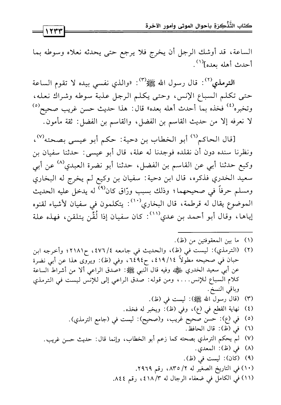 الترمذي «عن أبي سعيد الخدري قال: قال رسول الله والذي نفسي بيده لا تقوم الساعة حتى تكلم السباع الإنس، وحتى يكلم الرجل عذبة سوطه وشراك نعله وتخبره، فخذه بما أحدث أهله بعده» قال هذا حديث حسن غريب صحيح لا نعرف إلا من حديث القاسم بن الفضل، والقاسم بن الفضل ثقة مأمون.