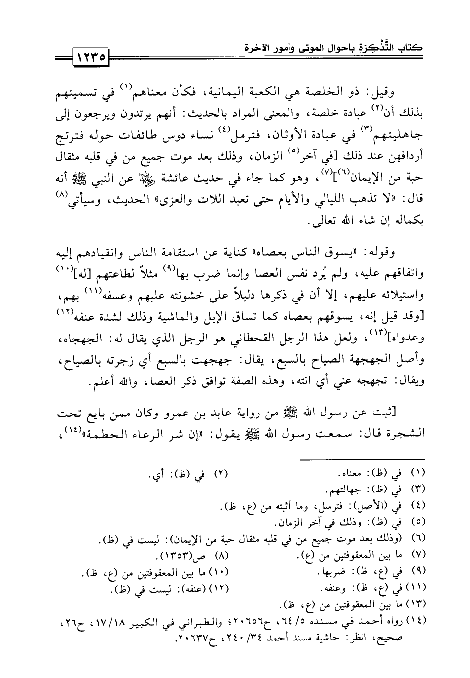 وقيل: ذو الخلصة هي الكعبة اليمانية، فكان معناهم في تسميتها بذلك أن عبادة خالصة، والمعنى المراد بالحديث أنهم يرتدون ويرجعون إلى جاهليتهم في عبادة الأوثان، فترسل نساء دوس طائفات حوله فترتج أردافهن عند ذلك في آخر الزمان، وذلك بعد موت جميع من قلبه مثقال حبة من إيمان وهو كم جاء في عائشة رضي الله عنه عن النبي صلى الله عليه وسلم أنه قال: «لا تذهب الليالي والأيام حتى تعبد اللات والعزى» الحديث وسيأتي بكماله.