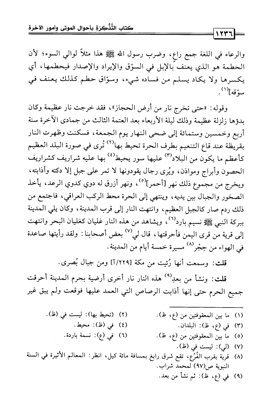 وقوله: حتى تخرج نار من أرض الحجاز، فقد خرجت نار عظمة، وكان بدؤها زلزلة عظيمة، وذلك ليلة الأربعاء بعد العتمة الثالث من جمادى الآخرة سنة أربع وخمسين وستمائة إلى ضحى النهار يوم الجمعة، فسكنت وظهرت النار بقرطبة عند قاع التنعيم بطرف الحرة يحيط بها قرى في صورة البلد العظيم كأعظم ما يكون البلدان.
