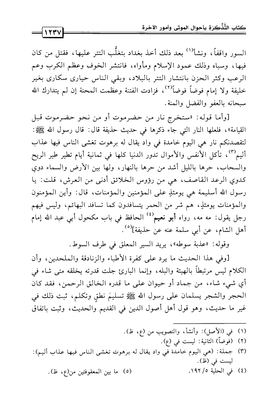 قال: قال رسول الله صلى الله عليه وسلم «لتقصدنكم اليوم نار هي اليوم خامدة في واد يقال له برجوت يغشى الناس فيها عذاب أليم تأكل الأنفس والأموال، تدور الدنيا كلها في ثمانية أيام تطير طير الريح والسحاب حرها بالليل أشد من حرها بالنهار، ولها بين الأرض والسماء دوي كدوي الرعد القاصف.
