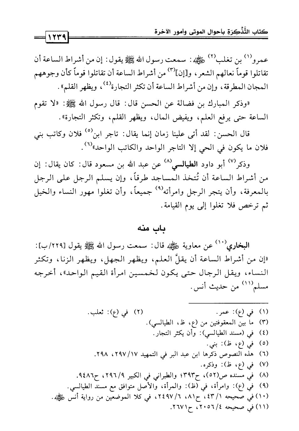 عمرو بن ثعلبة سمعت رسول الله صلى الله عليه وسلم يقول: إن من أشراط الساعة أن تقاتلوا قوماً نعالهم الشعر، وإن من أشراط الساعة أن تقاتلوا قوماً كأن وجوههم المجان المطرقة، وإن من أشراط الساعة أن تكثر التجارة ويظهر القلم» .