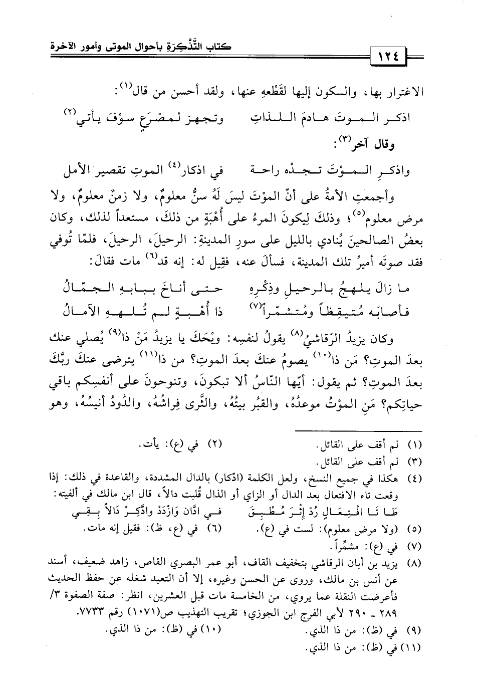 وكان يزيد الرقاشي يقول لنفسه: ويحك يا يزيد، من ذا يترضى عنك ربك الموت؟ ثم يقول: أيها الناس ألا تبكون وتنوحون على أنفسكم باقي حياتكم؟ من الموت طالبه والقبر بيته.