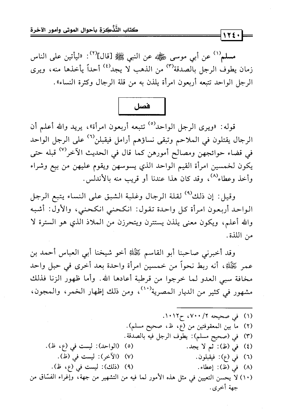 مسلم «عن أبي موسى عن النبي صلى الله عليه وسلم قال: ليأتين على الناس زمان يطوف الرجل بالصدقة من الذهب لا يجد أحداً يأخذها منه، قال: ويرى الرجل الواحد يتبعه أربعون امرأة يلذن به من قلة الرجال وكثرة النساء» .