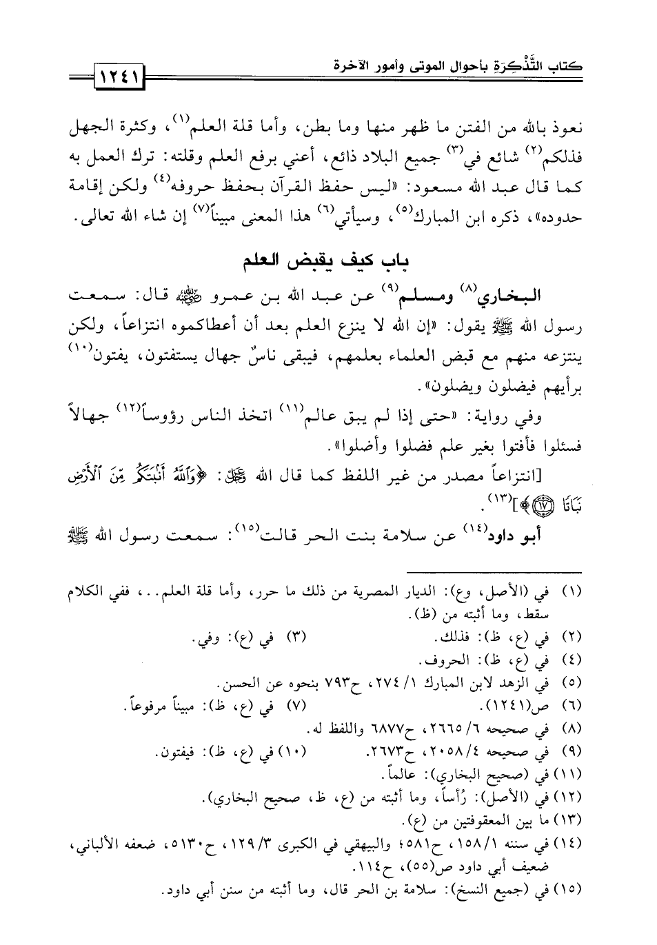 البخاري ومسلم رحمهما الله عن عبد الله بن عمرو قال: «سمعت رسول الله صلى الله عليه وسلم يقول: إن الله لا ينزع العلم بعد أن أعطاكموه انتزاعاً، ولكن ينزعه منهم مع قبض العلماء بعلمهم فيبقى ناس جهال يستفتون برأيهم فيضلون ويضلون» .