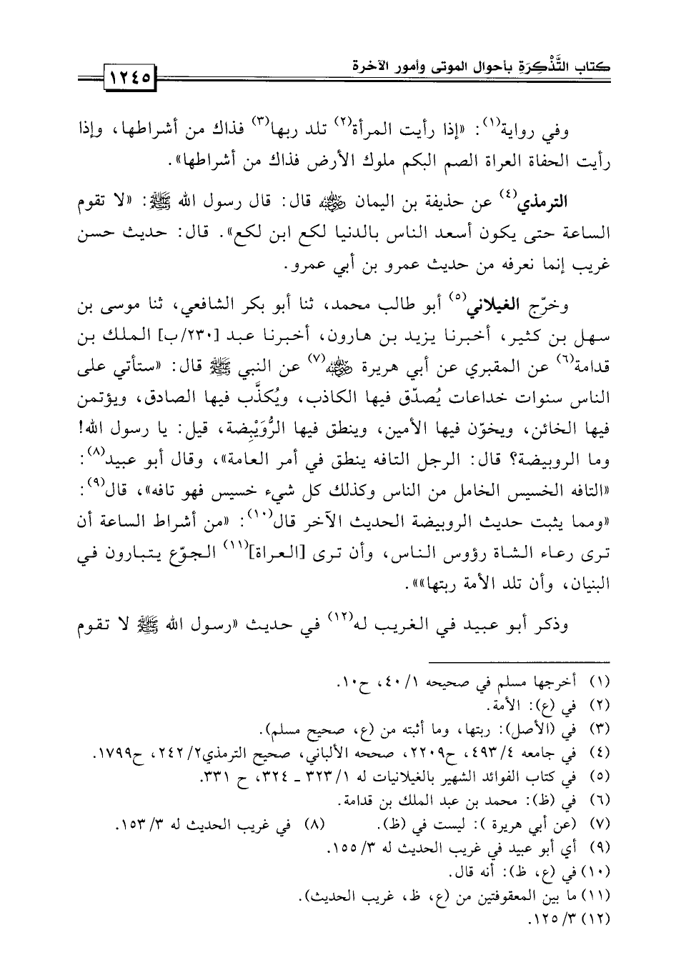 وخرج الغيلاني أبو طالب محمد: «حدثنا أبو بكر والشافعي: حدثنا موسى بن سهل بن كثير، أخبرنا يزيد بن هارون، أخبرنا محمد بن عبد الملك بن قدامة عن المقبري عن أبي هريرة عن النبي صلى الله عليه وسلم قال: سيأتي على الناس سنوات خداعات يصدق فيها الكاذب ويكذب فيها الصادق، ويؤتمن فيها الخائن ويخون فيها الأمين، وينطق فيها الرويبضة قيل يا رسول الله وما الرويبضة؟ قال: الرجل التافه ينطق في أمر العامة» وقال أبو عبيد: التافه الرجل الخسيس الخامل من الناس، وكذلك كل شيء خسيس فهو تافه قال: ومما يثبت حديث الرويبضة الحديث الآخر أنه قال: «من أشراط الساعة أن ترى رعاء الشاء رؤوس الناس، وأن ترى العراة الحفاة يتبارون في البنيان، وأن تلد الأمة ربتها» .