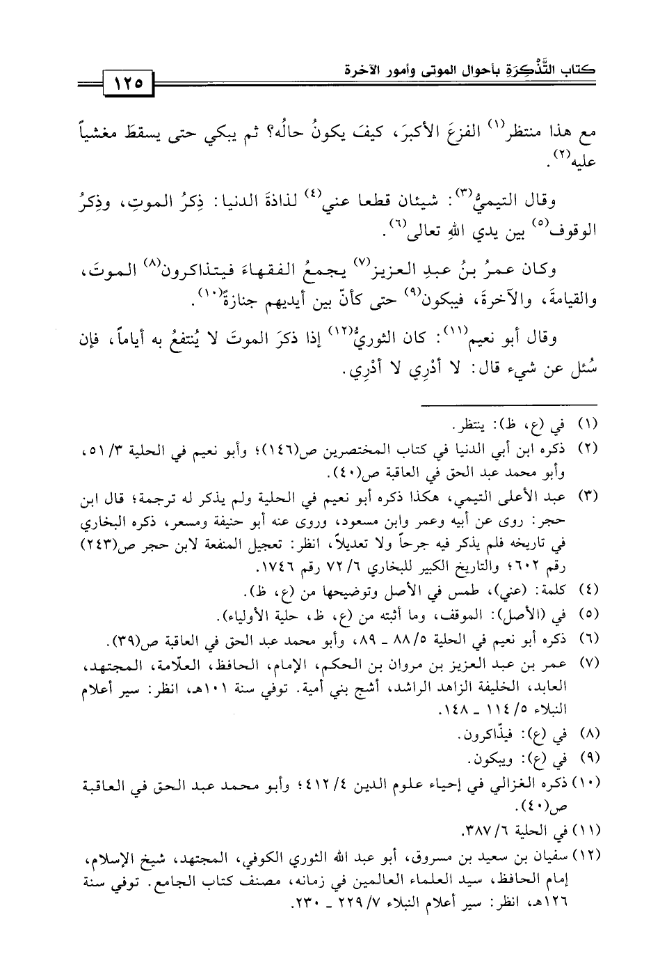 وقال أبو نعيم: كان الثوري إذا ذكر الموت لا ينتفع به أياماً.