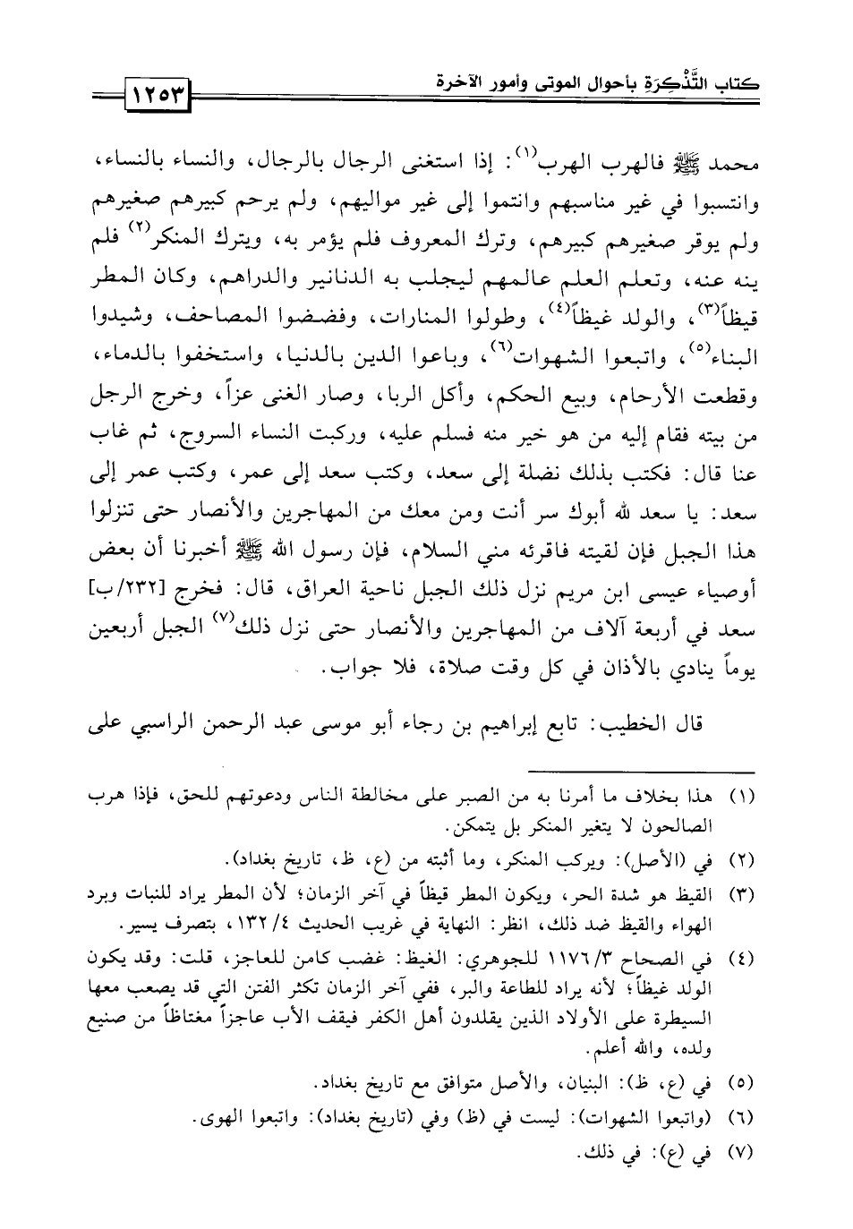 محمد صلى الله عليه وسلم الهرب فالهرب: إذا استغنى الرجال بالرجال والنساء بالنساء وانتسبوا في غير مناسبهم وانتموا إلى غير مواليهم، ولم يرحم كبيرهم صغيرهم ولم يوقر صغيرهم كبيرهم، وترك المعروف فلم يؤمر به وترك المنكر فلم ينه عنه، وتعلم عالمهم العلم ليجلب به الدراهم والدنانير، وكان المطر قيظاً، والولد غيظاً وطولوا المنارات وفضضوا المصاحف وشيدوا البناء واتبعوا الشهوات وباعوا الدين بالدنيا، واستخفوا بالدماء وقطعت الأرحام وبيع الحكم وأكل الربا وصار الغني عز وخرج الرجل من بيته فقام إليه من هو خير منه فسلم عليه، وركبت النساء السروج، ثم غاب عنا قال: فكتب بذلك نضلة إلى سعد فكتب سعد إلى عمر وكتب عمر إلى سعد يا سعد: لله أبوك سر أنت ومن معك من المهاجرين والأنصار حتى تنزلوا هذا الجبل فإن لقيته فأقرئه مني السلام، فإن رسول الله صلى الله عليه وسلم أخبرنا أن بعض أوصياء عيسى بن مريم نزل ذلك الجبل ناحية العراق، قال: فخرج سعد في أربعة آلاف من المهاجرين والأنصار حتى نزل ذلك الجبل فأقام أربعين يوماً ينادي بالأذان في كل وقت صلاة فلا جواب.