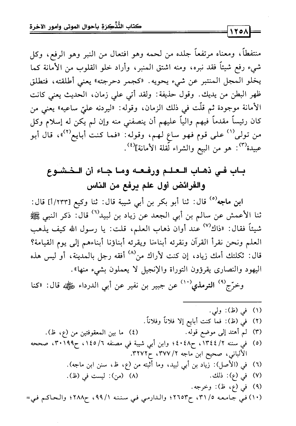 ابن ماجه قال: «حدثنا أبو بكر بن أبي شيبة قال: حدثنا وكيع قال: حدثنا الأعمش، عن سالم بن أبي الجعد، عن زياد بن لبيد قال: ذكر النبي صلى الله عليه وسلم شيئاً قال: ذللك عند أوان ذهاب العلم قلت يا رسول الله: كيف يذهب العلم ونحن نقرأ القرآن ونقرئه أبناءنا ويقرئه أبناؤنا أبناءهم إلى يوم القيامة؟ قال: ثكلتك أمك يا زياد: إن كنت لأراك من أفقه رجل بالمدينة أو ليس هذه اليهود والنصارى يقرأون التوراة والإنجيل لا يعملون بشيء منهما» .