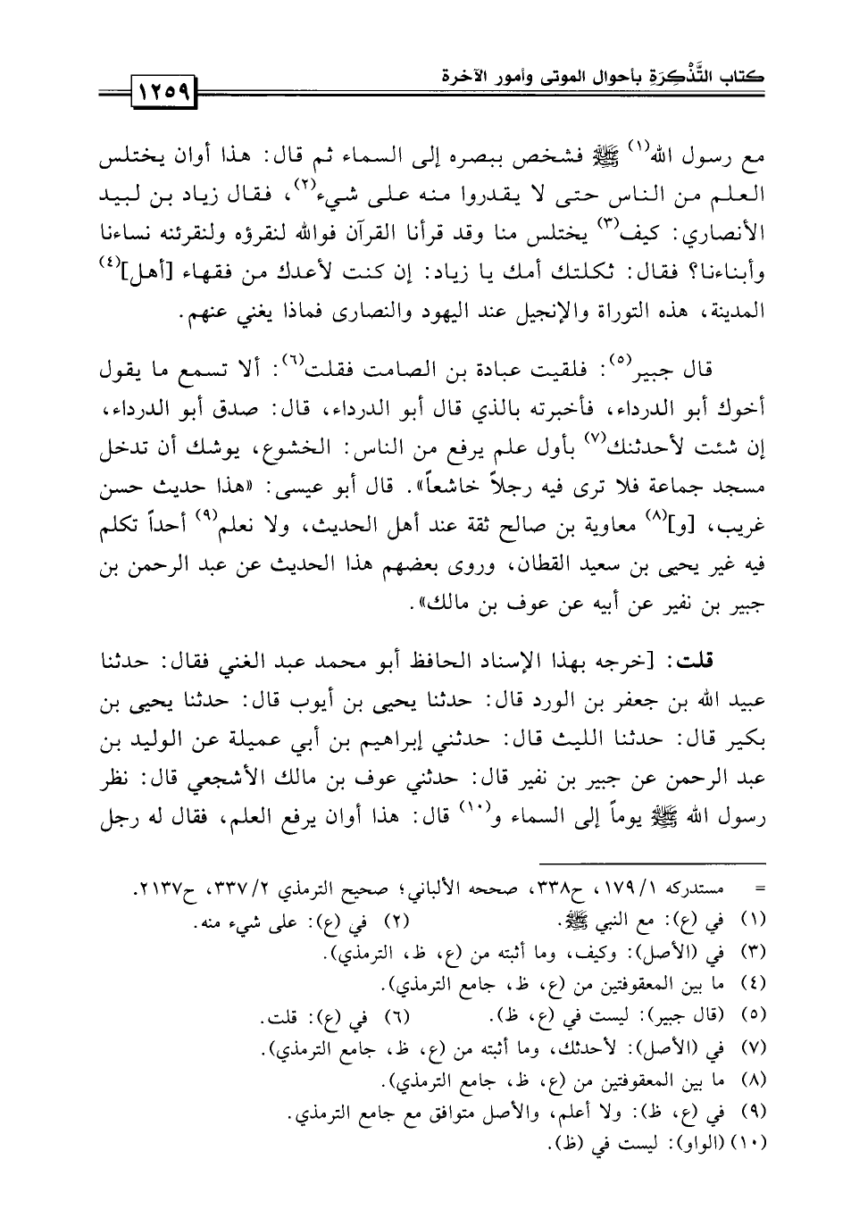 قال المؤلف رحمه الله: خرجه لهذا الإسناد الحافظ أبو محمد عبد الغني فقال: «حدثنا عبد الله بن جعفر بن الورد قال: حدثنا يحيى بن أيوب: حدثنا يحيى بن بكير قال: حدثنا الليث قال: حدثني إبراهيم بن أبي عبلة، عن الوليد بن عبد الرحمن عن جبير بن نفير قال: حدثني عوف بن مالك الأشجعي قال: نظر رسول الله صلى الله عليه وسلم إلى السماء يوماً وقال: هذا أوان رفع العلم فقال له رجل