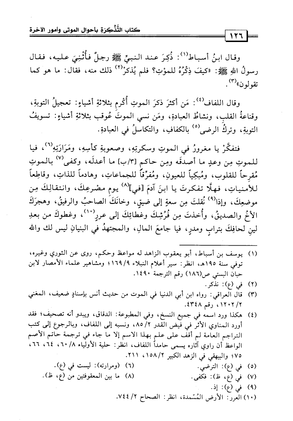 وقال أسباط: ذكر عند النبي صلى الله عليه وسلم رجل فأثنى عليه فقال عليه السلام: «كيف ذكره للموت؟ فلم يذكر ذلك عنه.
