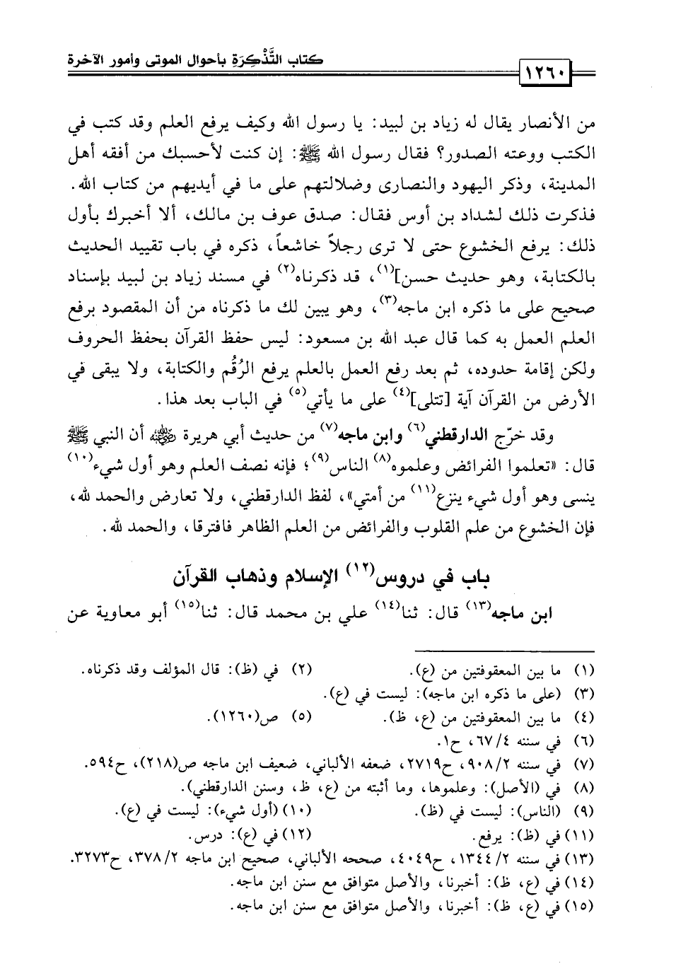 قلت: وقد ذكرناه في مسند زياد بن لبيد بإسناد صحيح على ما ذكره ابن ماجه وهو يبين لك ما ذكرناه من أن المقصود برفع العلم العمل به، كما قال عبد الله بن مسعود: ليس حفظ القرآن بحفظ الحروف ولكن إقامة حدوده، ثم بعد رفع العمل بالعلم يرفع القلم والكتاب ولايبقى في الأرض من القرآن آية تتلى على ما يأتي في الباب بعد هذا.