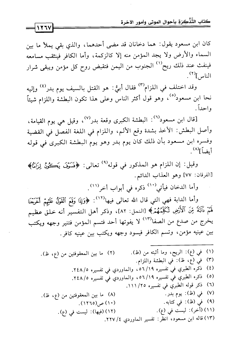 كان ابن مسعود يقول: هما دخانان قد مضى أحدهما والذي بقي يملأ ما بين السماء والأرض ولا يجد المؤمن منه إلا كالزكمة، وأما الكافر فتثقب مسامعه فتبعث مسامعه فتبعث عند ذلك الريح الجنوب من اليمن فتقبض روح كل مؤمن ومؤمنة ويبقى شرار الناس.