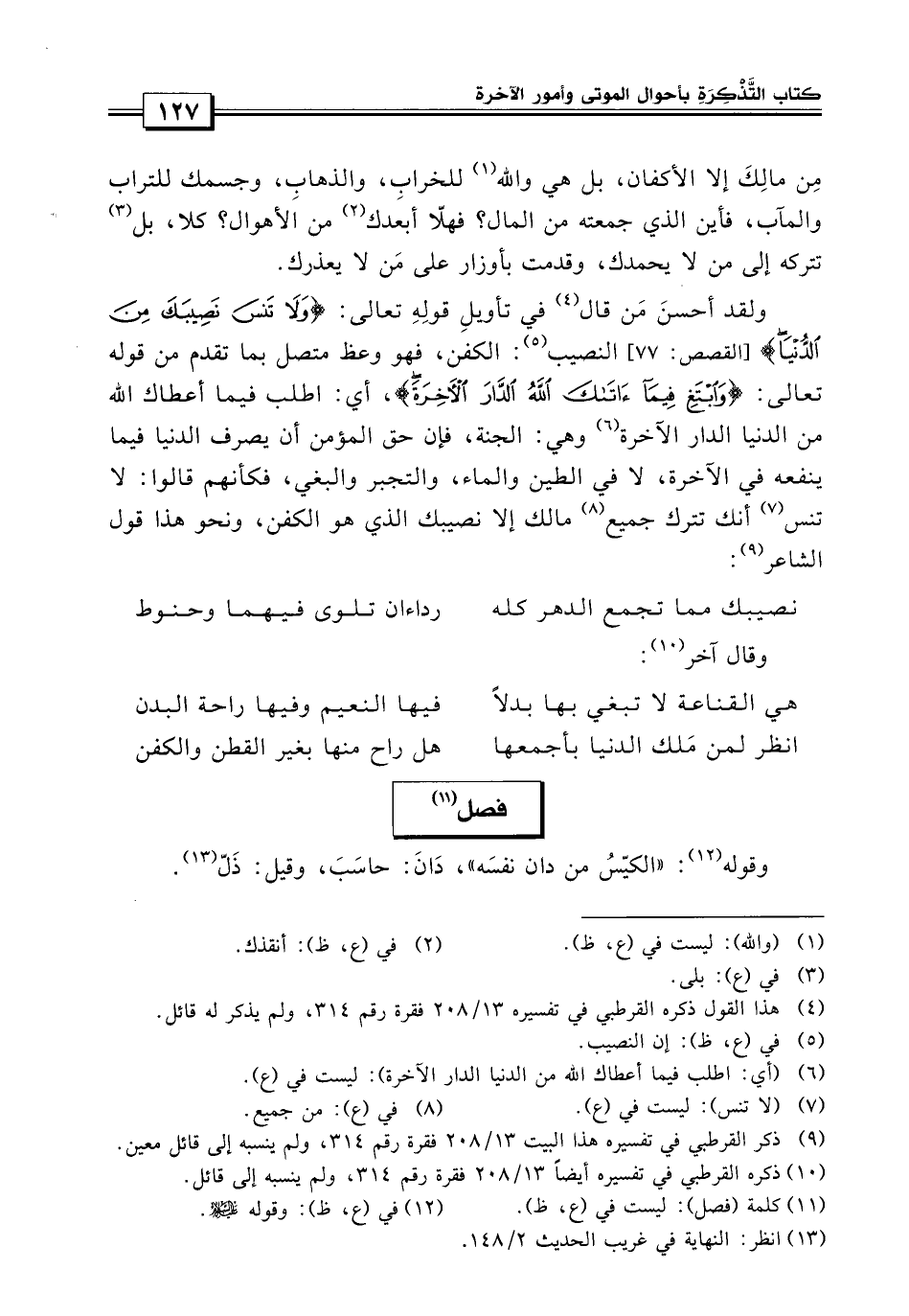 ولقد أحسن من قال في تفسير قوله تعالى: {وابتغ فيما آتاك الله الدار الآخرة} أي: اطلب فيما أعطاك الله من الدنيا، الدار الآخرة وهي الجنة، فإن حق المؤمن أن يصرف الدنيا فيما ينفعه في الآخرة، لا في الطين والماء والتجبر والبغي، فكأنهم قالوا: لا تنس أنك تترك جميع مالك إلا نصيبك الذي هو الكفن، ونحو هذا قول الشاعر: