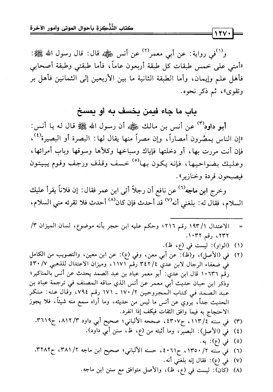 وفي رواية «عن أبي معن عن أنس قال: قال رسول الله صلى الله عليه وسلم أمتي على خمس طبقات كل طبقة أربعون عاماً، فأما طبقتي وطبقة أصحابي فأهل علم وإيمان، وأما الطبقة الثانية ما بين الأربعين إلى الثمانين فأهل بر وتقوى» ثم ذكر نحوه.