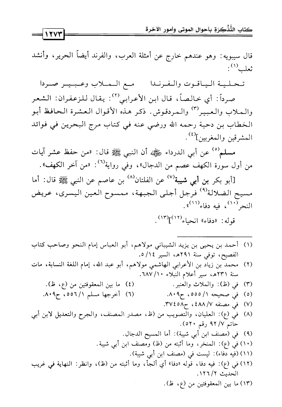 أبو بكر بن أبي شيبة، «عن الفلتان بن عاصم، عن النبي صلى الله عليه وسلم قال: أما مسيح الضلالة فرجل أجلى الجبهة ممسوح العين اليسرى عريض المنخر فيه الدفاء» قوله فيه: دفا أي انحناء.