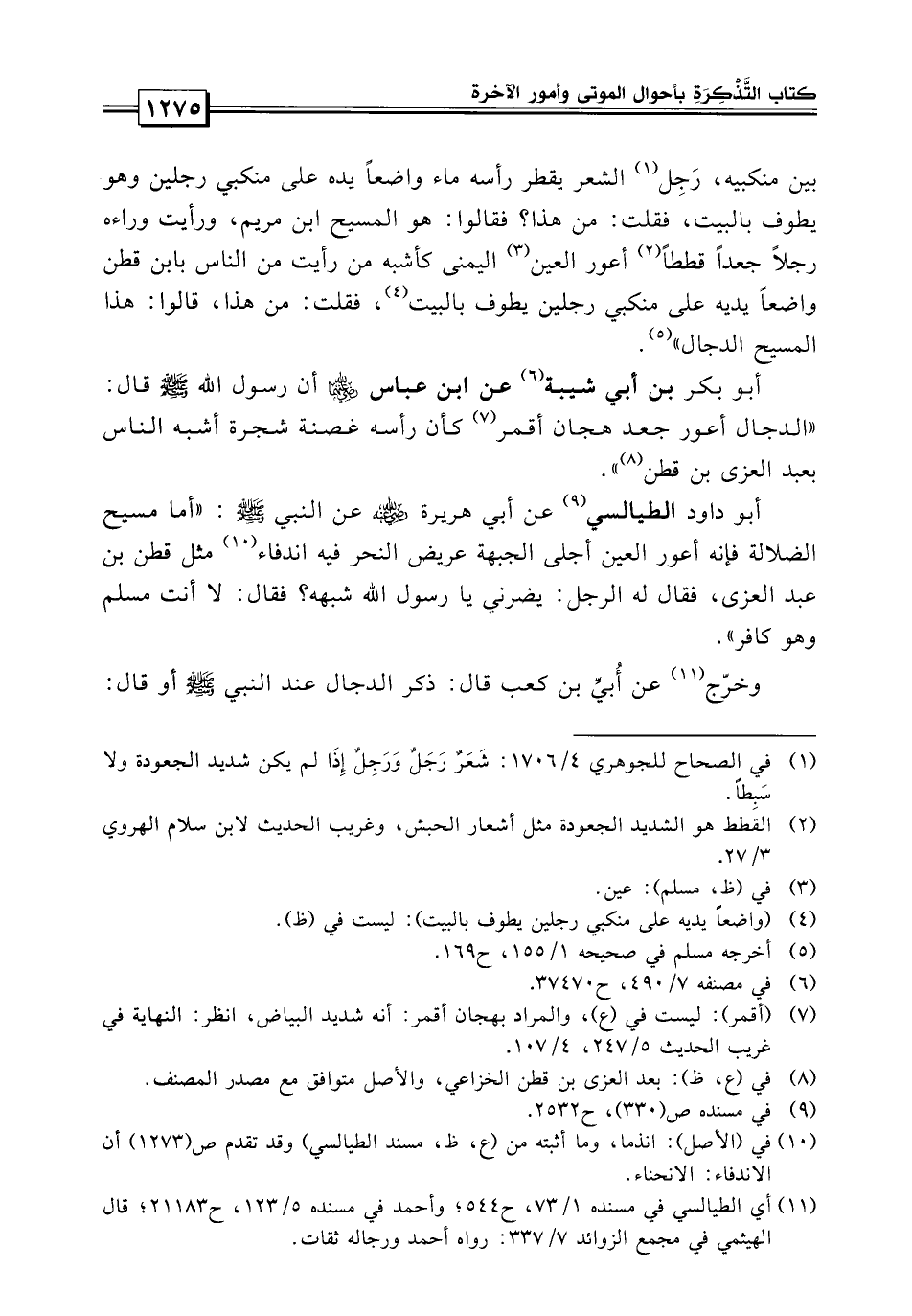 أبو بكر بن أبي شيبة «عن ابن عباس أن رسول الله صلى الله عليه وسلم قال: الدجال أعور مدهجان أقمر كأن رأسه غضنة شجرة أشبه الناس بعبد العزي بن قطن الخزاعي فإما أهلك هلك فإنه أعور وأن الله ليس بأعور..