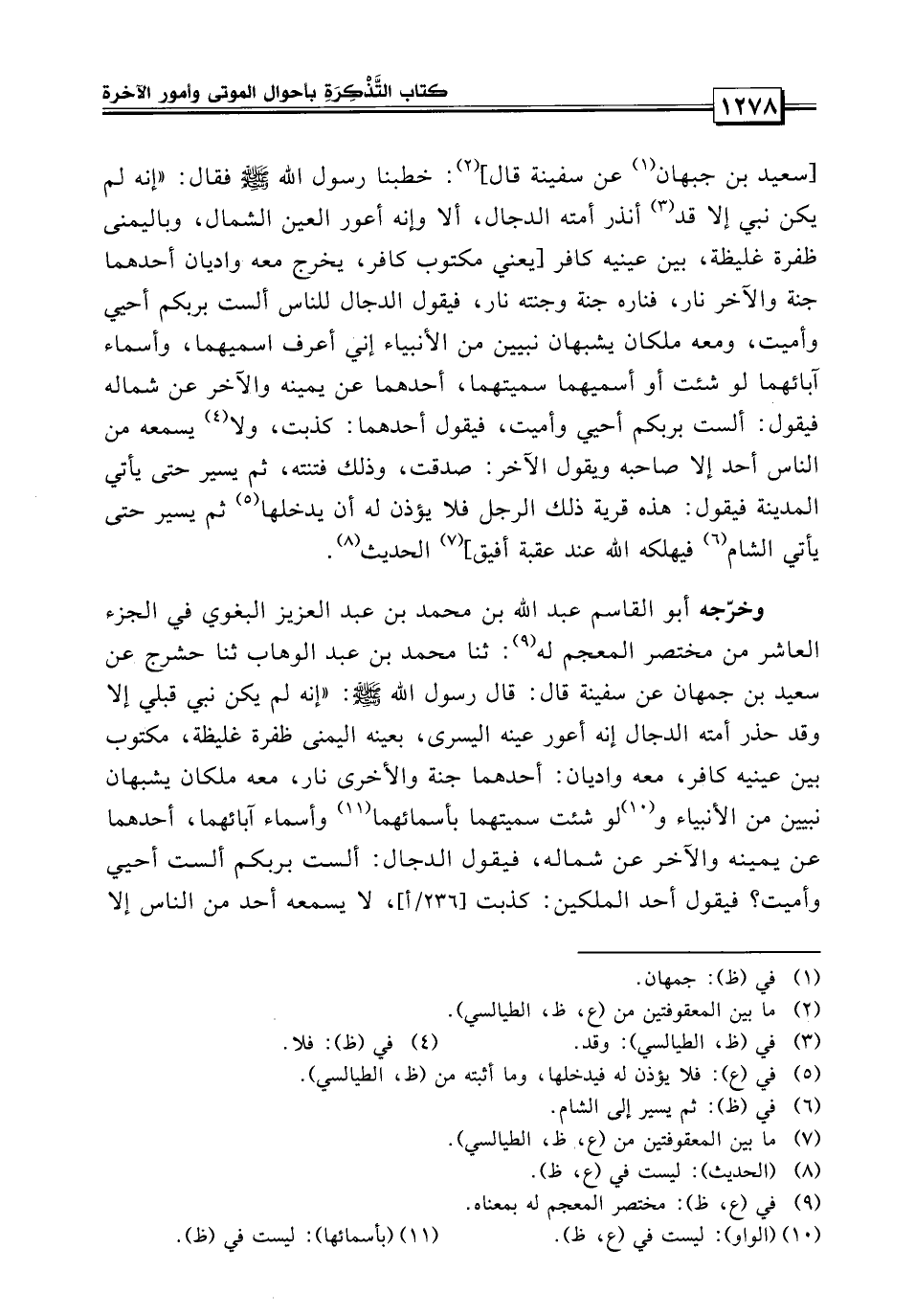 وخرجه أبو القاسم عبد الله بن محمد بن عبد العزيز البغوي في الجزء العاشر من مختصر المعجم له بمعناه فقال: «حدثنا محمد بن عبد الوهاب قال: حدثنا حشرج عن سعيد ابن جمهان عن سفينة قال: قال رسول الله صلى الله عليه وسلم: إنه لم يكن نبي قبل إلا وقد حذر أمته من الدجال إنه أعور عينه اليسرى بعينه اليمنى ظفرة غليظة مكتوب بين عينيه كافر يقرؤه كل مؤمن بالله معه واديان: أحدهما جنة والآخر نار، ومعه ملكان يشبهان نبين من الأنبياء، ولو شئت سميتهما بأسماء وأسماء آبائهما، أحدهما عن يمينه والآخر عن شماله فيقول الدجال: ألست بربكم أحيي وأميت فيقول أحد الملكين: كذبت فلا يسمعه أحد من الناس إلا