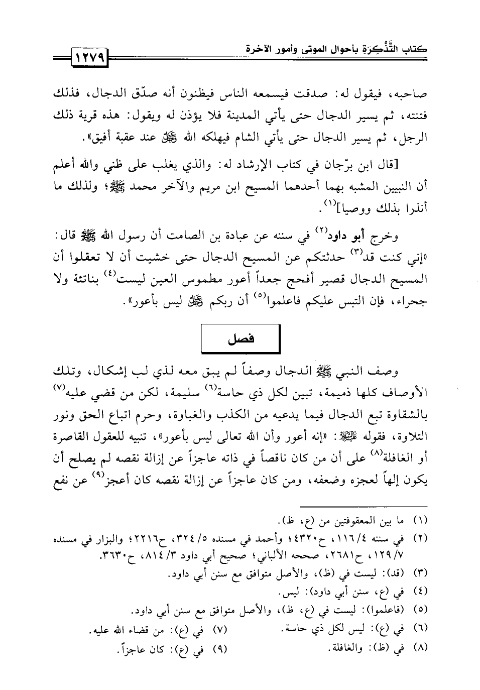 وصف النبي صلى الله عليه وسلم الدجال وصفاً لم يبق معه لذي لب إشكال ولتك الأوصاف كلها ذميمة تبين لكل ذي حاسة سليمة، لكن من قضى الله عليه بالشقاوة تبع الدجال فيما يدعيه من الكذب والغباوة وحرم اتباع الحق ونور التلاوة، فقوله عليه الصلاة والسلام «إنه أعور وأن الله ليس بأعور» تبيين للعقول القاصرة أو الغافلة على أن من كان ناقصاً في ذاته عاجزاً عن إزالة نقصه لم يصلح أن يكون إلها لعجزه وضعفه، ومن كان عاجزاً عن إزالة نقصه كان أعجز عن نفع