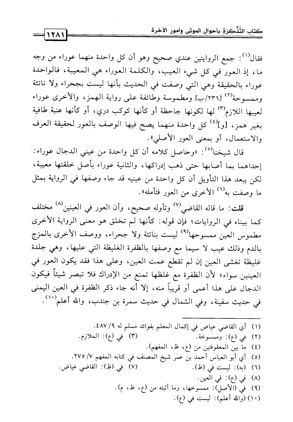قلت: ما قاله القاضي عياض وتأويله صحيح، وأن العور في العينين مختلف كما بيناه في الروايات، فإن قوله: كأنها لم تخلق هو معنى الرواية الأخرى مطموس العين ممسوخها ليست بناتئة ولا حجراء، ووصف الأخرى بالمزج بالدم وذلك عيب عظيم لا سيما مع وصفها بالظفرة الغليظة التي هي عليها وهي جلدة غليظة تغشى العين.