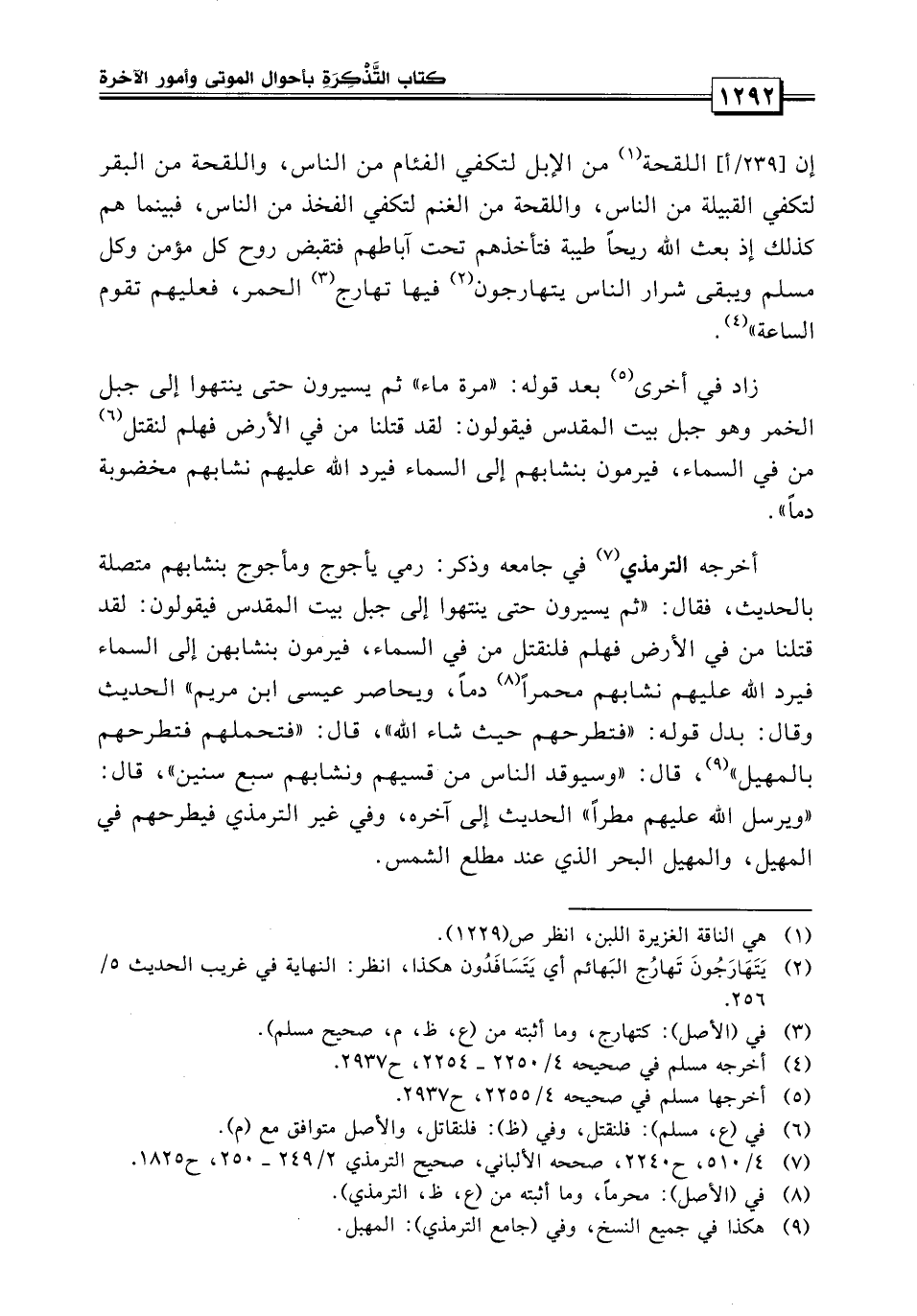 زاد في أخرى بعد قوله مرة ماء ثم يسيرون حتى ينتهوا إلى جبل الخمر وهو جبل بيت المقدس فيقولون: لقد قتلنا من في الأرض فلنقتل من في السماء فيرمون بنشابهم إلى السماء فيرد الله عليهم نشابهم مخضوبة دماً» أخرجه الترمذي في جامعه.