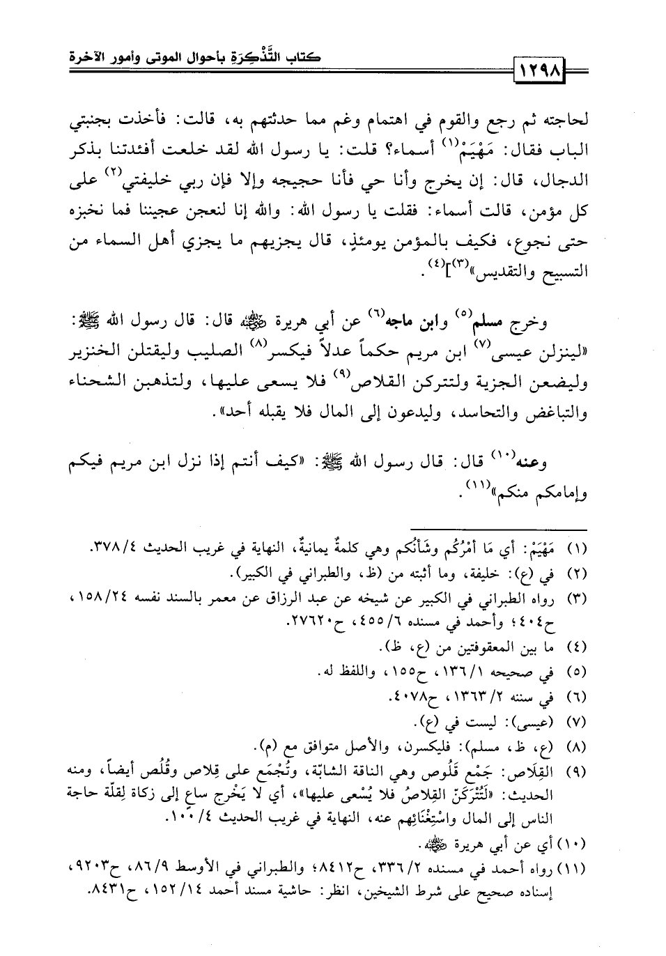 وخرج مسلم وابن ماجه «عن أبي هريرة قال: قال رسول الله صلى الله عليه وسلم: لينزلن ابن مريم حكماً عدلاً فليكسرن الصليب وليقتلن الخنزير وليضعن الجزية وليتركن القلاص فلا يسعى عليها، وليذهبن الشحناء والتباغض والتحاسد وليدعون الناس إلى المال فلا يقبله أحد» .