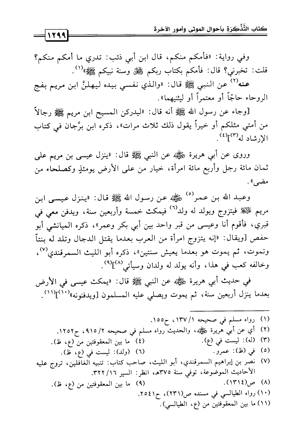 «وعن عبد الله بن عمرو عن رسول الله صلى الله عليه وسلم قال: ينزل عيسى بن مريم فيتزوج ويولد له ولد ويمكث خمساً وأربعين سنة ويدفن معي في قبري، فأقوم أنا وعيسى من قبر واحد بين أبي بكر وعمر» ذكره الميانشي أبو حفص ويقال: «إنه يتزوج امرأة من العرب بعد ما يقتل الدجال وتلد له بنتاً فتموت ثم يموت هو بعد ما يعيش سنتين» ذكره أبو الليث السمرقندي وخالفه كعب في هذا وأنه يولد له ولدان وسيأتي.