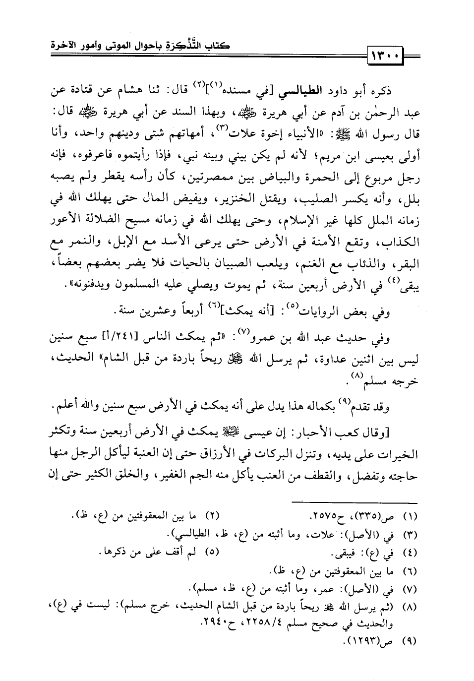 ذكره أبو داود الطيالسي في مسنده قال حدثنا هشام عن قتادة عن عبد الرحمن بن آدم عن أبي هريرة، وبهذا السند «عن أبي هريرة قال: قال رسول الله صلى الله عليه وسلم الأنبياء إخوة لعلات أمهاتهم شتى ودينهم واحد وأنا أولى بالناس بعيسى بن مريم، لأنه لم يكن بيني وبينه نبي فإذا رأيتموه فاعرفوه فإنه رجل مربوع إلى الحمرة والبياض بين ممصرتين كأن رأسه يقطر ولم يصبه بلل، وأنه يقتل الخنزير ويكسر الصليب ويفيض المال حتى يهلك في زمانه الملك كلها غير الإسلام، وحتى يهلك الله في زمانه مسيح الضلالة الأعور الكذاب، وتقع الأمنة في الأرض حتى يرعى الأسد مع الإبل والنمر مع البقر والذئب مع الغنم، ويلعب الصبيان بالحيات فلا يضر بعضهم بعضاً يبقى في الأرض أربعين سنة ثم يموت ويصلي عليه المسلمون ويدفنونه» وفي بعض الروايات: «أنه يمكث أربعاً وعشرين سنة» .