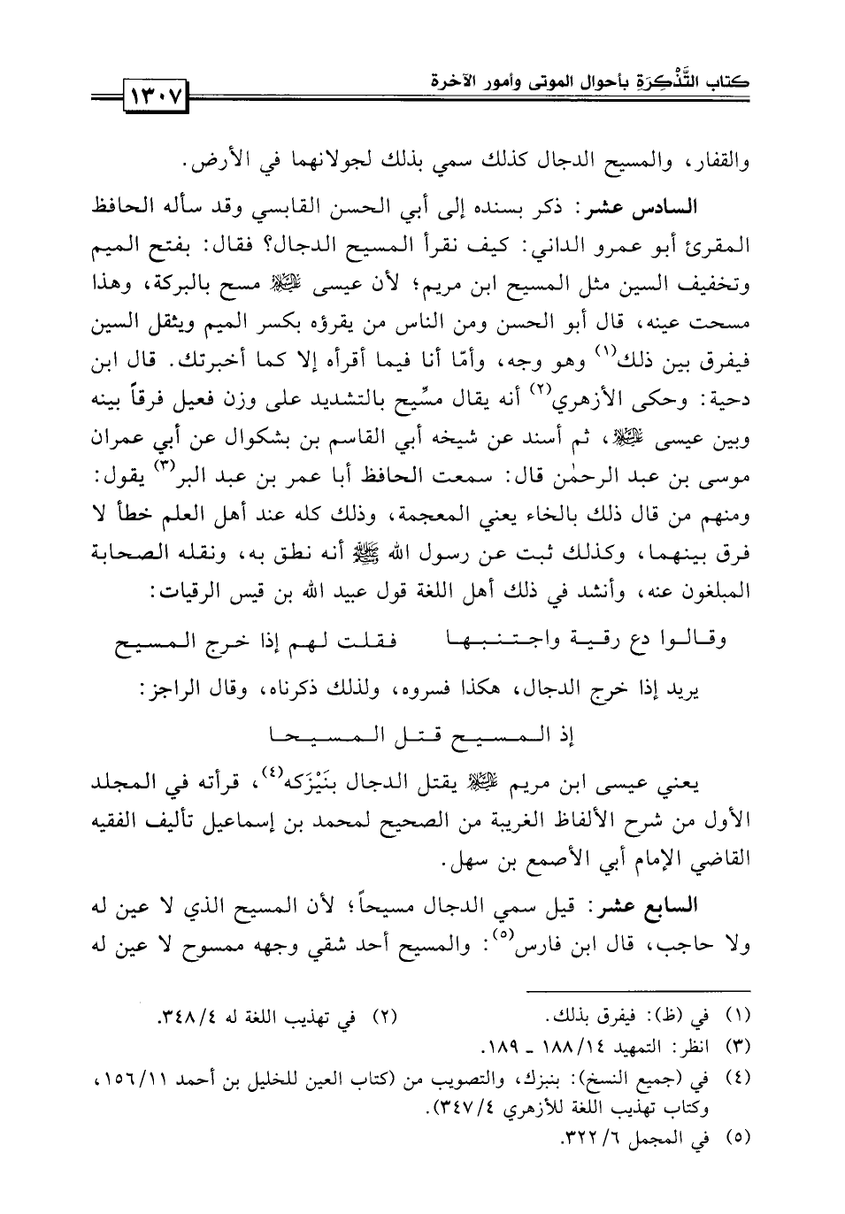 القول السادس عشر: ذكره بسنده إلى أبي الحسن القابسي، وقد سأله الحافظ النقري أبو عمرو الداني: كيف يقرأ المسيح الدجال؟ فقال: بفتح الميم وتخفيف السين مثل المسيح بن مريم لأن عيسى عليه السلام مسح بالبركة وهذا مسحت عينه.