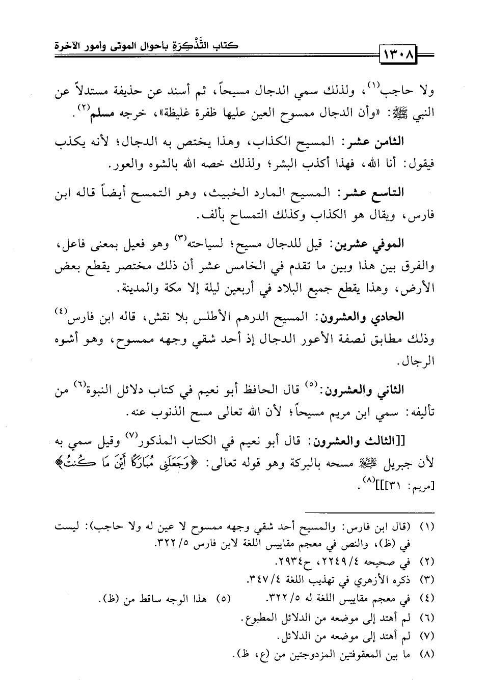 ولا حاجب، ولذلك سمي الدجال مسيحاً، ثم أسند عن حذيفة مستدلاً عن رسول الله صلى الله عليه وسلم وأن الدجال ممسوح العين عليها ظفرة غليظة خرجه مسلم.