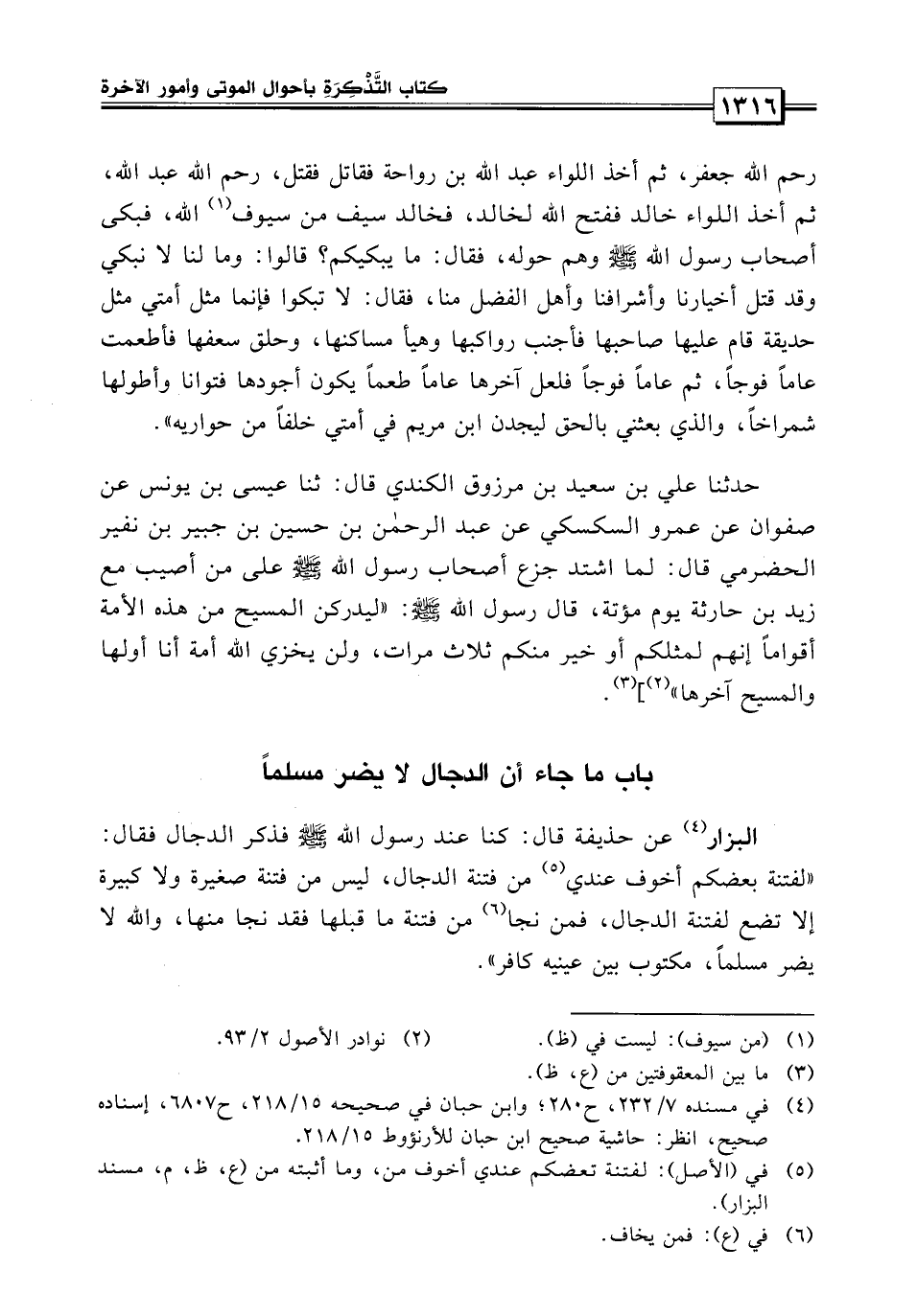 البزار «عن حذيفة قال: كنا عند رسول الله صلى الله عليه وسلم فذكر الدجال فقال: لفتنة من بعضكم أخوف عندي من فتنة الدجال ليس من فتنة صغيرة ولا كبيرة إلا تضع لفتنة الدجال، فمن نجا من فتنة ما قبلها فقد نجا منها والله لا يضر مسلماً.