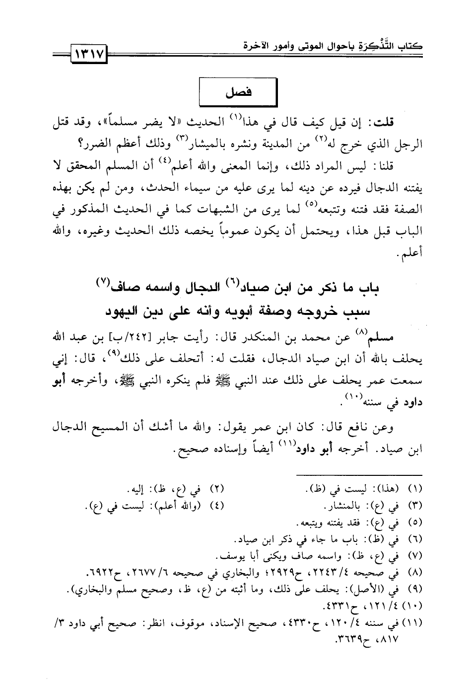 قلت: إن قيل: كيف قال في هذا الحديث لا يضر مسلماً، وقد قتل الرجل الذي خرج إليه من المدينة ونشره بالمنشار وذلك أعظم الضرر؟ قلنا: ليس المراد ذلك وإنما المعنى أن المسلم المحقق لا يفتنه الدجال فيرده عن دينه لما يرى عليه من سيماء الحدث، ومن لم يكن بهذه الصفة فقد يفتنه ويتبعه لما يرى من الشبهات كما في الحديث المذكور في الباب قبل هذا.