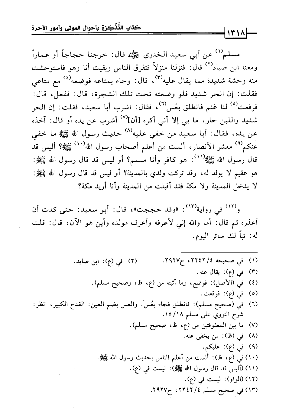 مسلم عن أبي سعيد الخدري قال: خرجنا حجاجاً أو عماراً ومعنا ابن صياد قال فنزلنا منزلاً فتفرق الناس وبقيت أنا وهو فاستوحشت منه وحشة شديدة مما يقال عليه قال: وجاء بمتاعه فوضعه على متاعي فقلت: إن الحر شديد فلو وضعته تحت تلك الشجرة قال ففعل فرفعت لنا غنم فانطلق بعس فقال: اشرب أبا سعيد فقلت: إن الحر شديد واللبن حار ما بي إلا أني أكره أن أشرب عن يده أو قال: آخذه عن يده فقال: أبا سعيد من خفي عليه حديث رسول الله صلى الله عليه وسلم ما خفي عليكم مشعر الأنصار ألست من أعلم أصحاب رسول الله صلى الله عليه وسلم! أليس قد قال رسول الله صلى الله عليه وسلم: «هو كافر وأنا مسلم» ، أو ليس قد قال رسول الله صلى الله عليه وسلم: «لا يدخل المدينة ولا مكة فقد أقبلت من المدينة وأنا مكة» ! وفي رواية: وقد حججت قال أبو سعيد: حتى كدت أني أعذره ثم قال: أما والله إني لأعرفه وأعرف مولده وأين هو الآن.