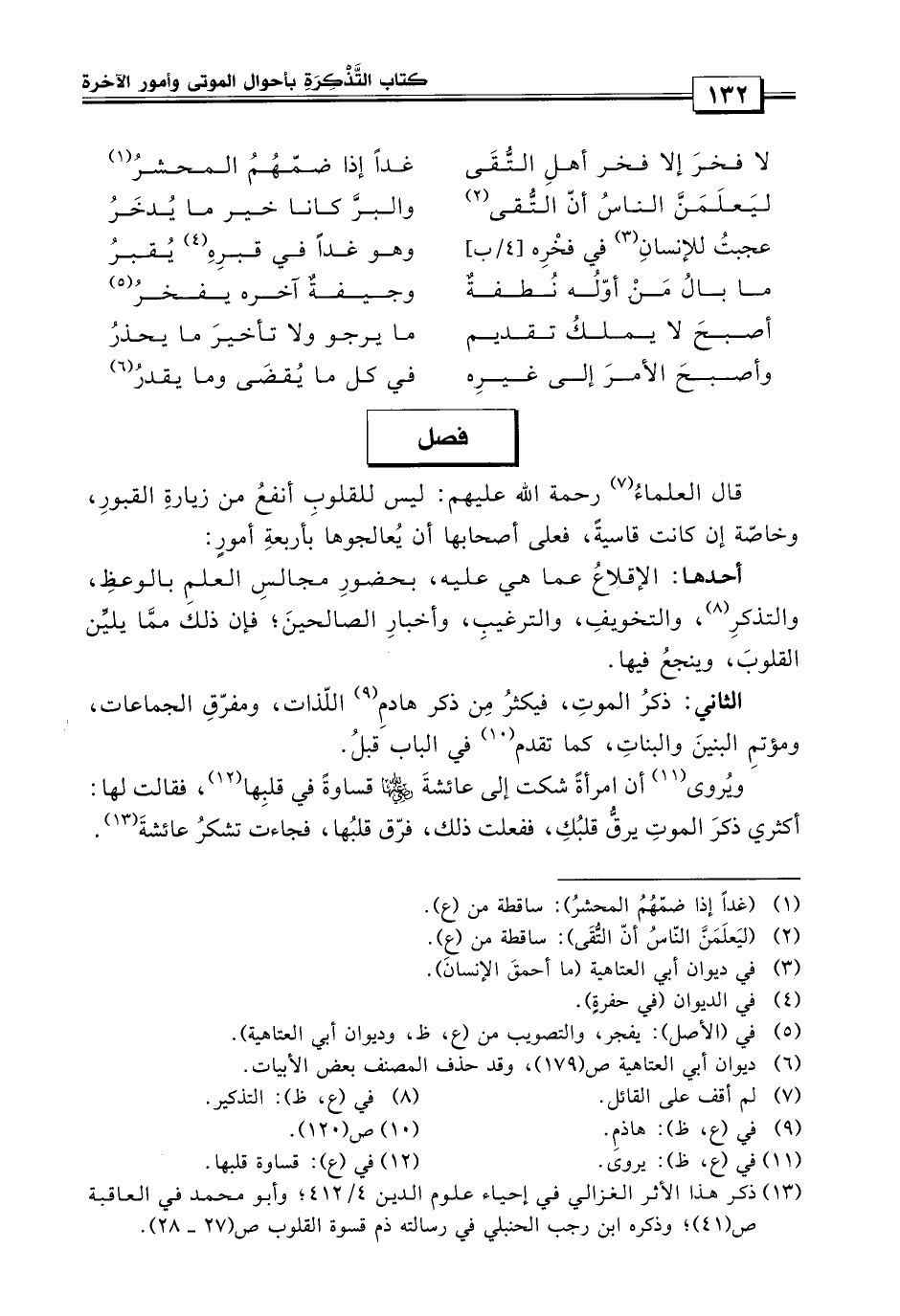 فصل: قال العلماء رحمة الله عليهم: ليس للقلوب أنفع من زيارة القبور وخاصة إن كانت قاسية فعلى أصحابها أن يعالجوها بأربعة أمور:
