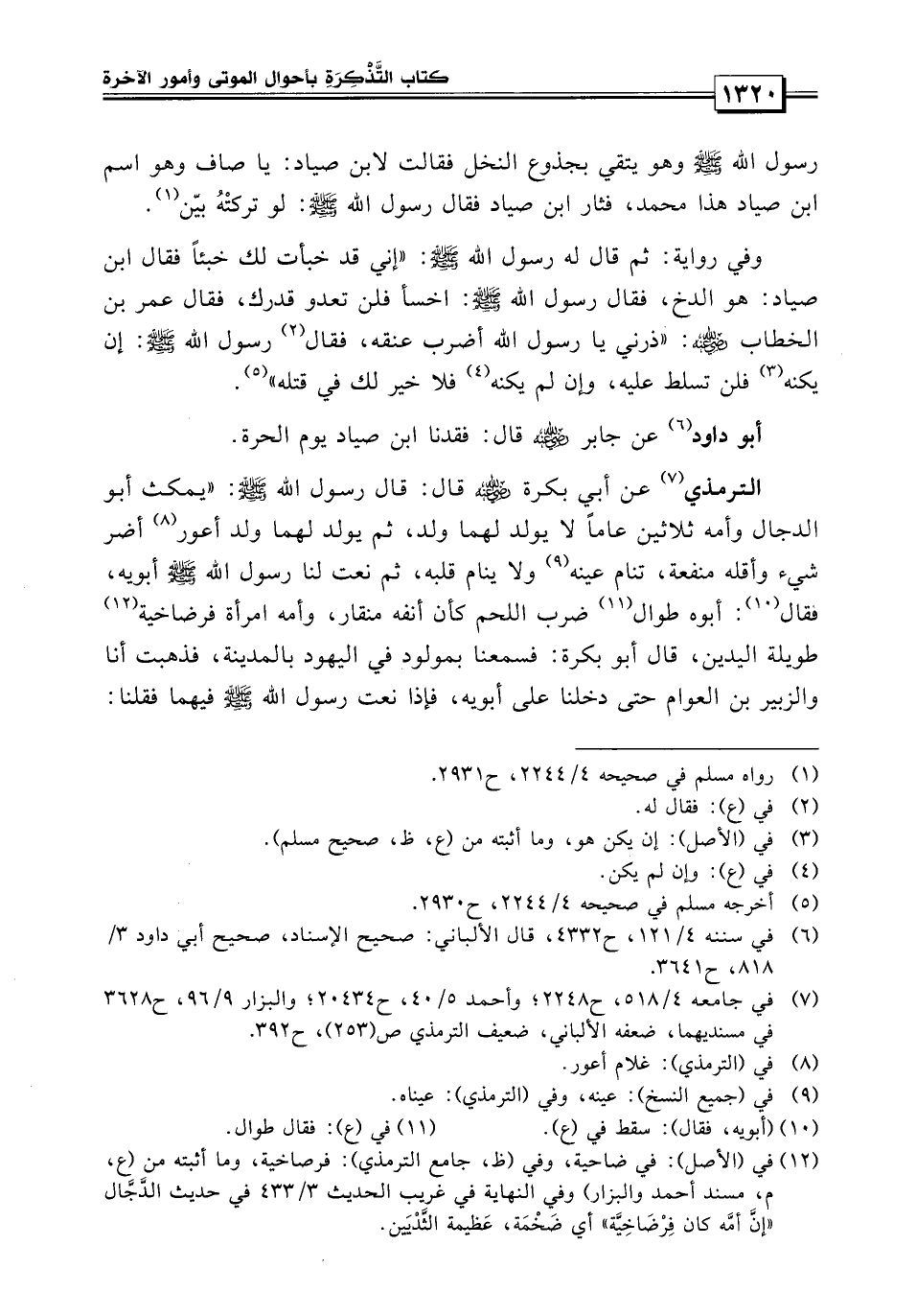 الترمذي «عن أبي بكرة قال: قال لها رسول الله صلى الله عليه وسلم: يمكث أبو الدجال وأمه ثلاثين عاماً لا يولد لهما ولد، ثم يولد لهما ولد أعور أضر شيء وأقله منفعة تنام عينه ولا ينام قلبه، ثم نعت لنا رسول الله صلى الله عليه وسلم أبويه فقال: أبوه طوال ضرب اللحم كأن أنفه منقار وأمه امرأة فرضاخية طويلة اليدين» ، قال أبو بكر: فسمعنا بمولود في اليهود بالمدينة فذهبت أنا والزبير بن العوام حتى دخلنا على أبويه، فإذا نعت رسول الله صلى الله عليه وسلم فيهما فقلنا: