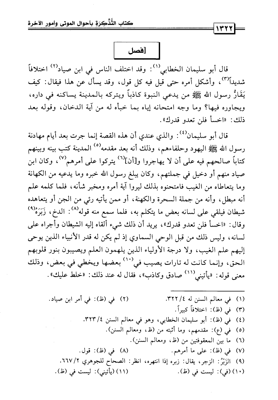 قال أبو سليمان والذي عندي أن هذه القضية إنما جرت معه أيام مهادنة رسول الله صلى الله عليه وسلم اليهود وحلفاءهم، وذلك أنه بعد مقدمه المدينة كتب بينه وبينهم كتاباً وصالحهم فيه على أن لا يهاجروا وأن يتركوا على أمرهم، وكان ابن صياد منهم أو دخيلاً في جملتهم وكان يبلغ رسول الله صلى الله عليه وسلم خبره وما يدعيه من الكهانة ويتعاطاه من الغيب، فامتحنوه بذلك ليروا آية أمره فلما كلمه علم أنه معطل وأنه من جملة السحرة والكهنة يأتيه ربيب من الجنة أو يتعاهده شيطان فيلقى على لسانه بعض ما يتكلم به، فلما سمع منه قول الدخ زجره وقال: اخسأ ولن تعدو قدرك يريد أن ذلك شيء ألقاه إليه الشيطان، وأجراه على لسانه، وليس ذلك من قبل الوحي إذ لم يكن له قدر الأنبياء الذين يوحى إليهم علم الغيب ولا درجة الأولياء الذين يلهمون العلم ويصيبون بنور قلوبهم الحق، وإنما كانت له تارات يصيب في بعضها ويخطئ في بعض وذلك معنى قوله: «يأتي صادق وكاذب» .